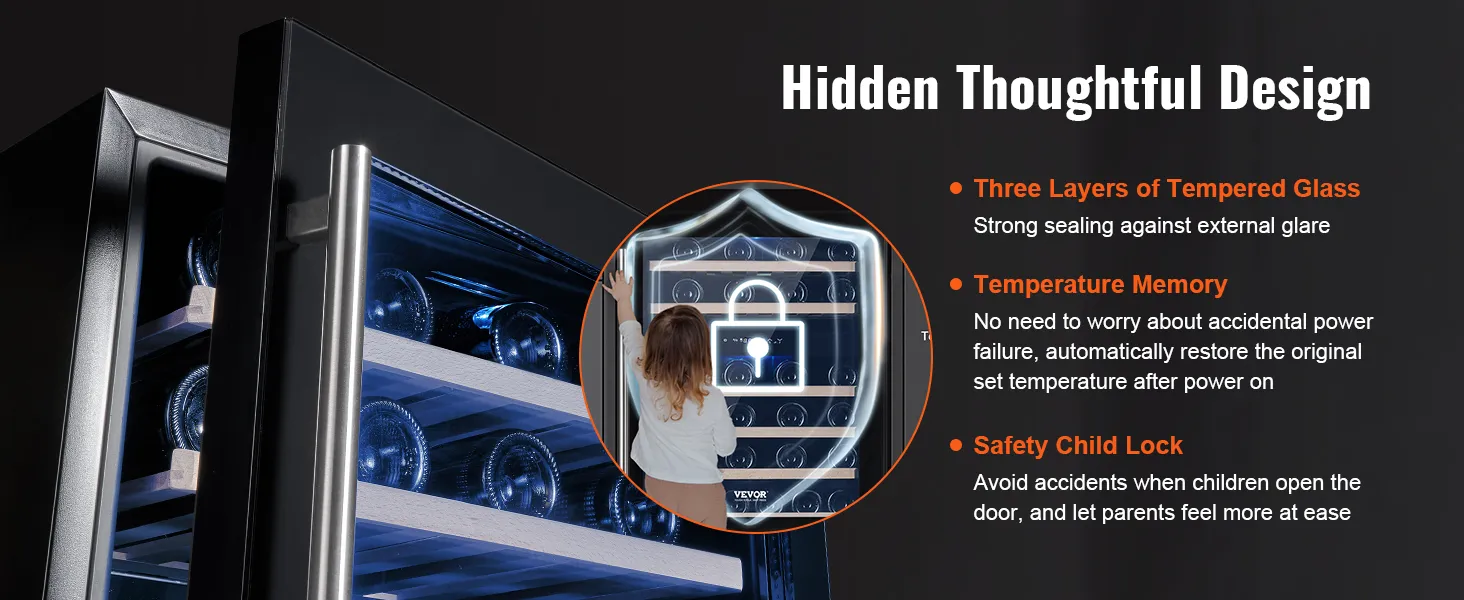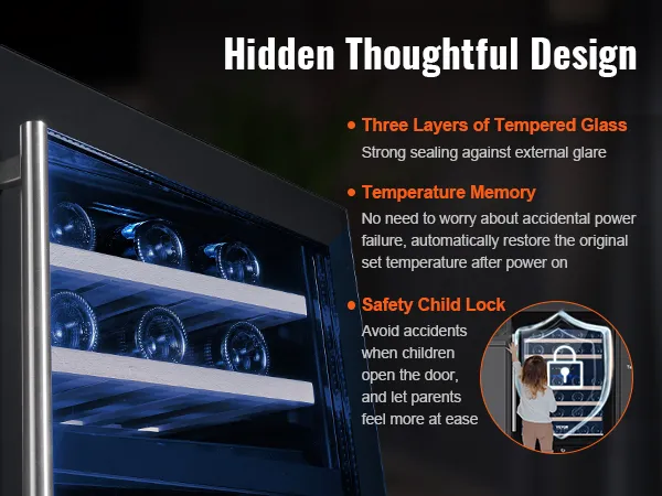 The VEVOR wine cooler has a child lock feature for safety. It keeps the wine collection secure from curious hands. The lock ensures that the temperature settings remain unchanged. This feature provides peace of mind for families with children. Your wines stay safe and properly maintained. Child lock makes it a household choice because it blends functionality with safety for a better user experience. This safety feature adds an extra layer of protection to your investment.