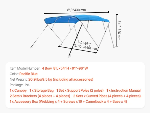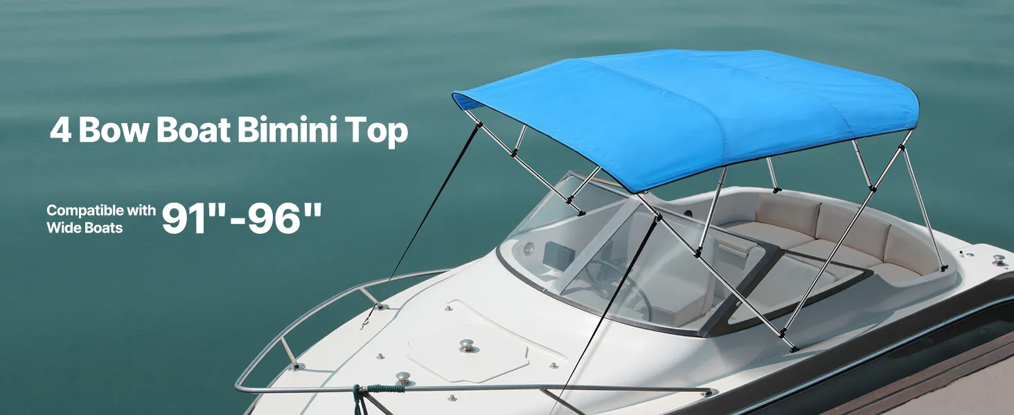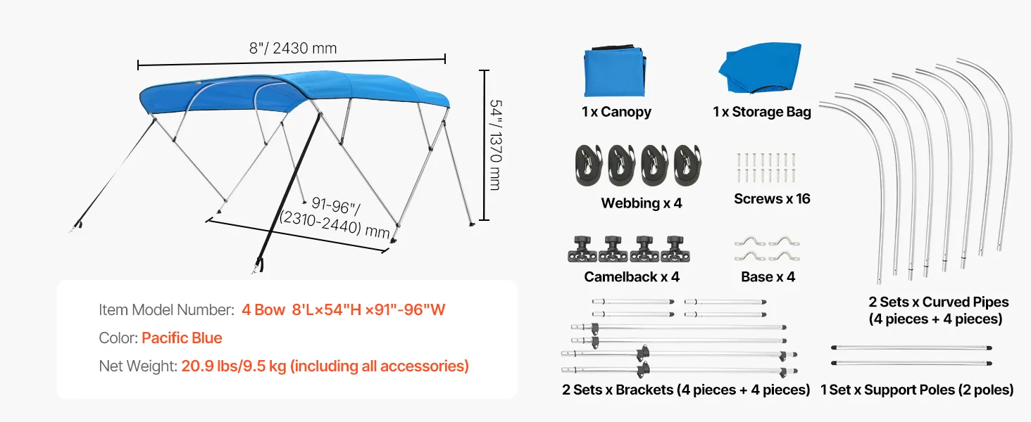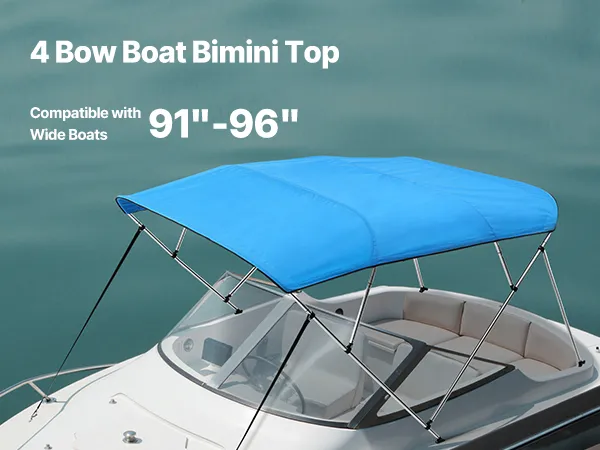 Choose Your Ideal Size: Available in a variety of sizes, including 4 Bow 8'Lx(91"-96")W x 54"H. Simply measure your boat’s deck width and pick the awning that fits your boat.