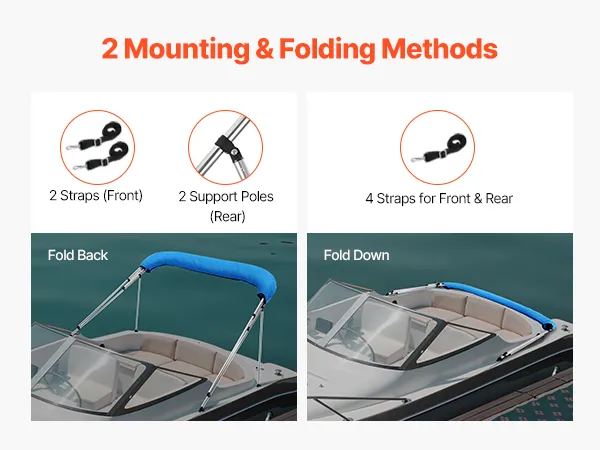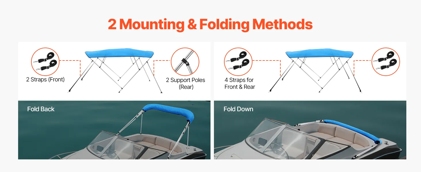 Choose from two installation methods to secure the awning on your boat, allowing for both downward and backward folding. The included straps with quick-release buckles make setup fast and easy.