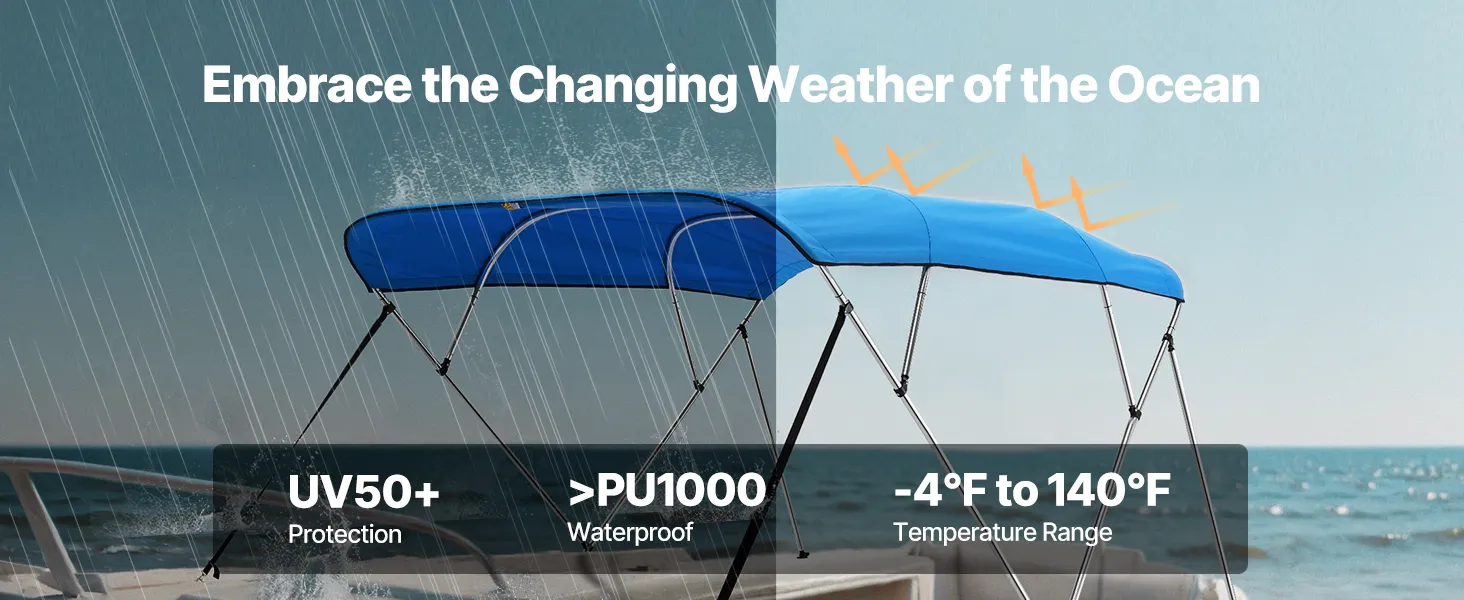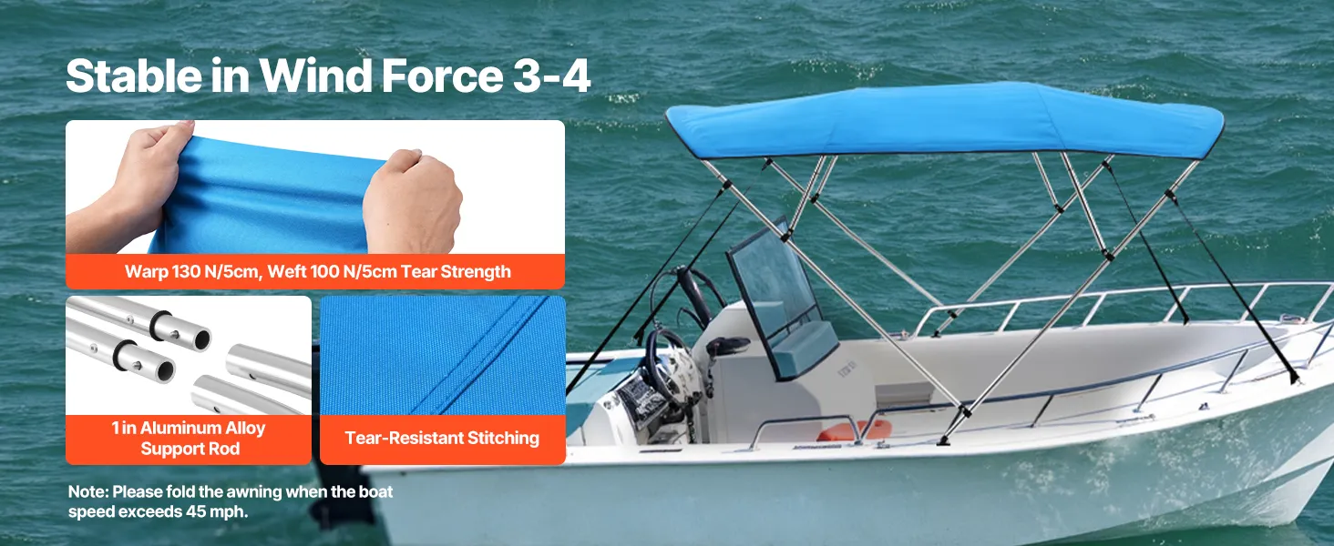 Wind-Resistant Up to 45 MPH: Built to handle wind speeds up to level 3-4, this boat bimini top features sturdy 1-inch thick aluminum poles and connectors for solid support. No more worrying about it flipping over or swaying in strong winds. Tip: If your boat speed exceeds 45 mph, it’s easy to fold the canopy for security.