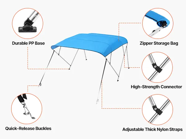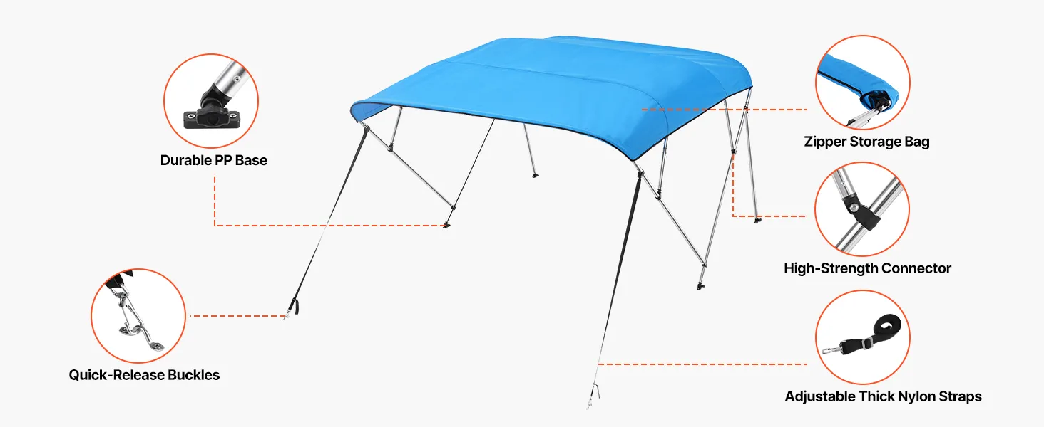 Quick & Easy Setup: Installation is a breeze with the aluminum alloy frame, pre-drilled base, and adjustable nylon straps. Whether you have a pontoon, canoe, aluminum dinghy, or fishing boat, this bihimi top fits easily on most boat types, getting you back to enjoying the water in no time.