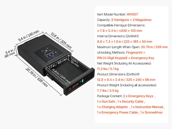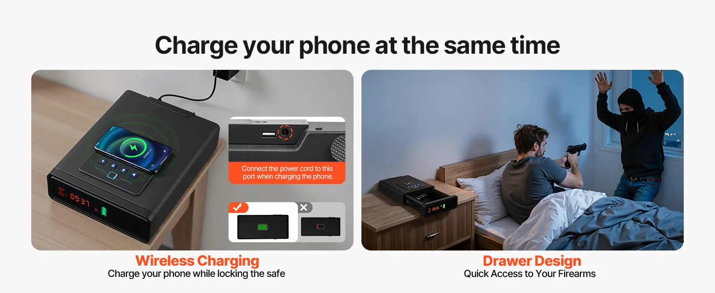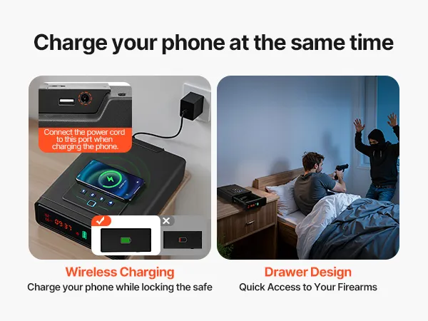 Quick Access: This firearm case box holds 2 full-size handguns and 2 magazines, with a drawer for fast access. When closed, it supports wireless phone charging to keep your devices ready for emergencies