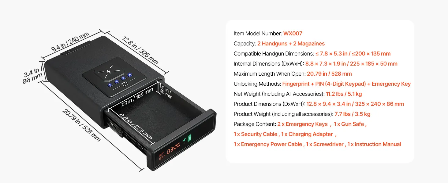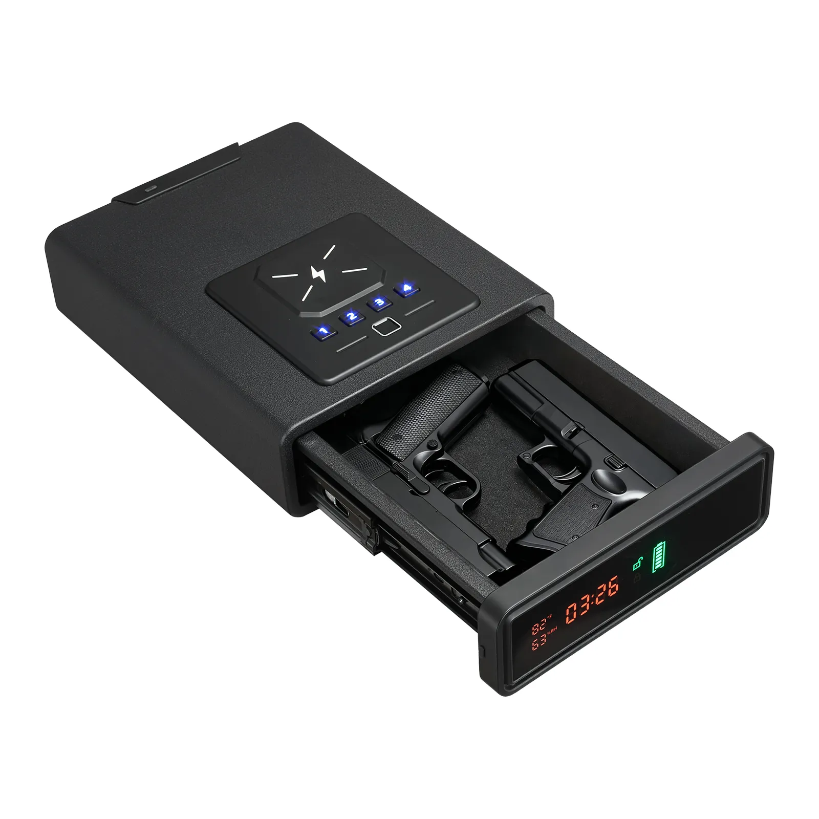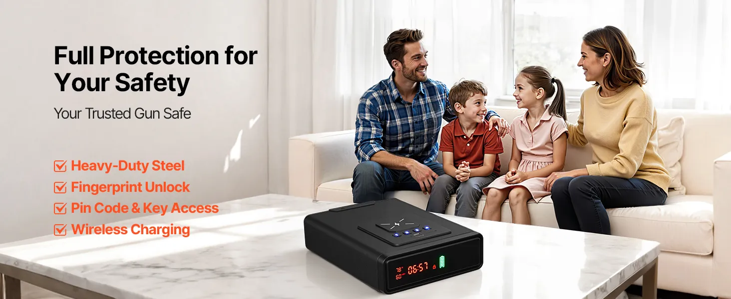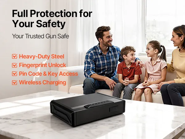 This handgun safe secures your home and valuables. It holds 2 handguns and 2 magazines with fingerprint, code, and key access, and features wireless charging to keep your firearms and devices ready for emergencies.