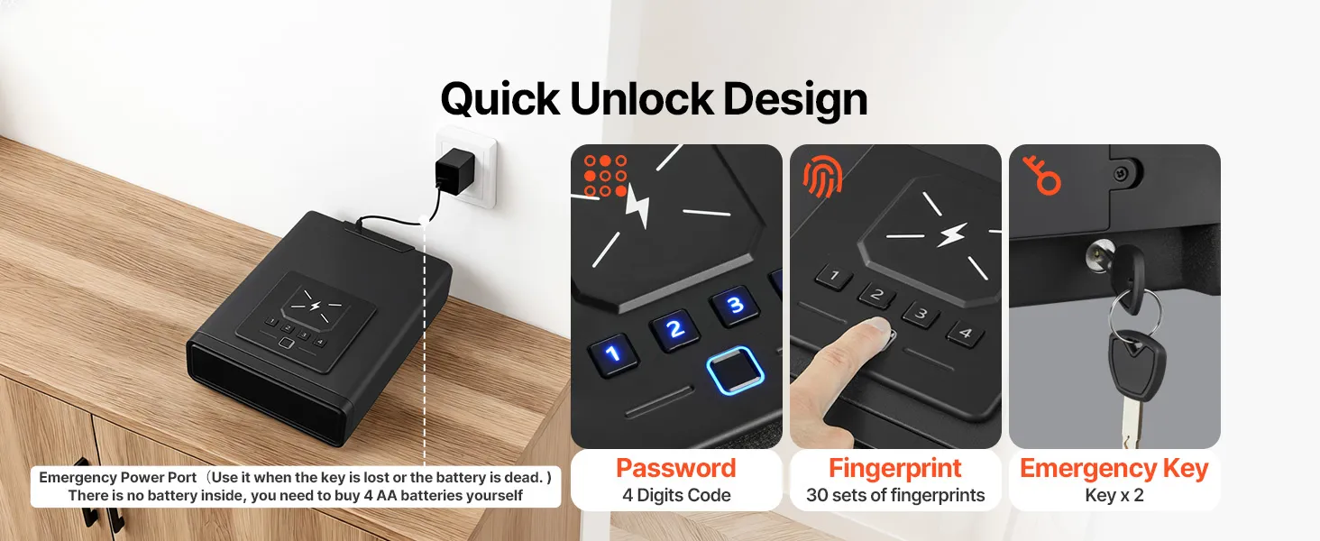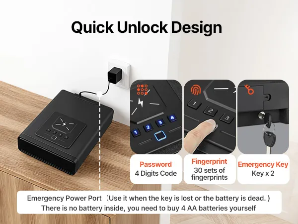 3 Access Methods: This handgun safe provides 3 unlock options—store 30 fingerprints or a 4-digit code to block unauthorized access. Includes 2 spare keys and an emergency charging port for quick access if batteries die or code is forgotten