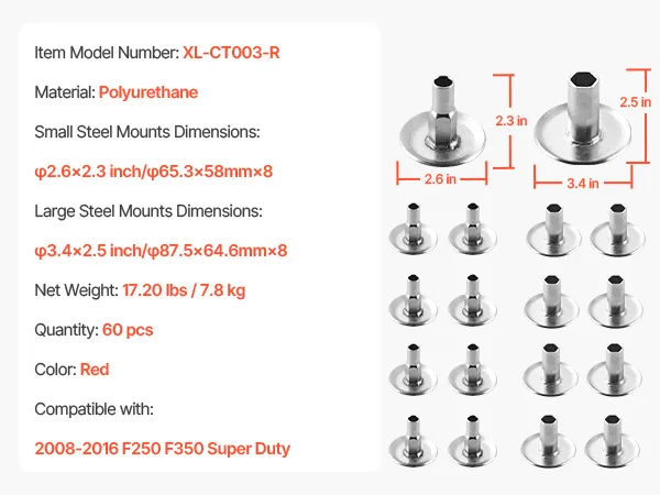 VEVOR Body Mount Bushing Kit, Compatible with 2008-2016 F250 F350 Super Duty, 60 PCS Polyurethane Body Mount Kit, Quick Replacement, Durable Components for Improving Bumpy Driving Performance, Red VEVOR Body Mount Bushing Kit, Compatible with 2008-2016 F250 F350 Super Duty, 60 PCS Polyurethane Body Mount Kit, Quick Replacement, Durable Components for Improving Bumpy Driving Performance, Red