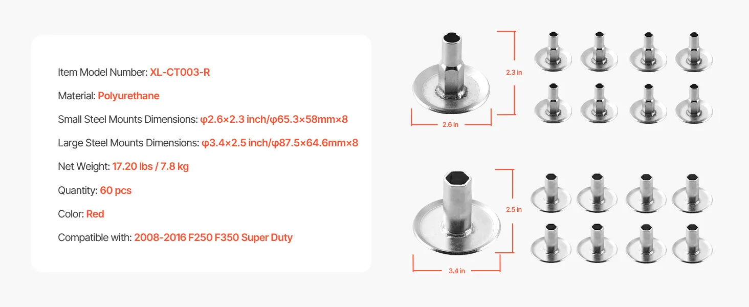 • Vehicle Compatibility: This body mount bushing kit is compatible with 2008-2016 F250 & F350 Super Duty models. It is precisely designed for direct replacement of worn-out body mount bushings
