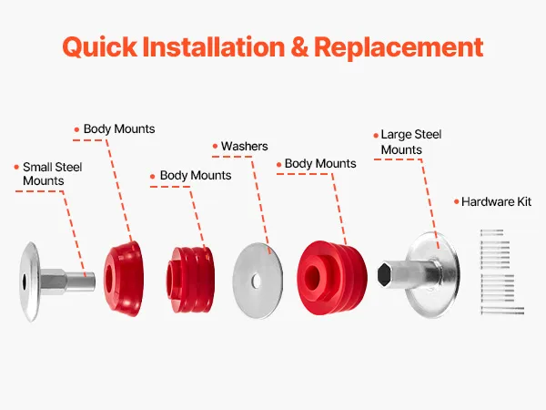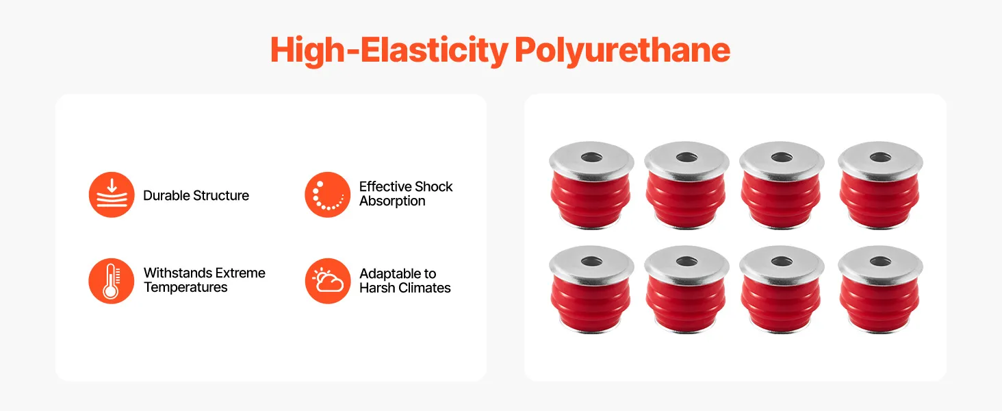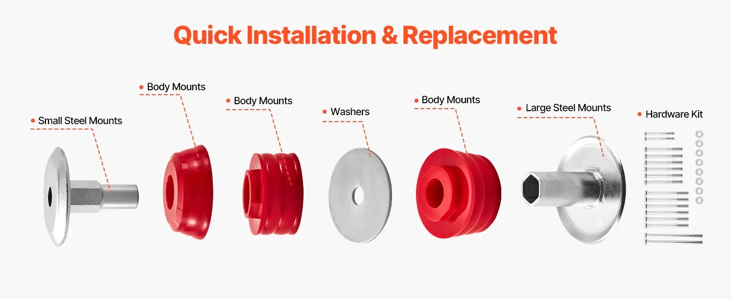 The excellent polyurethane used to make each body bushing in the VEVOR mount kit ensures your truck receives a dependable, long-lasting part. Polyurethane bushings will not rot, split, or wear out as quickly as conventional rubber ones, even under difficult conditions.