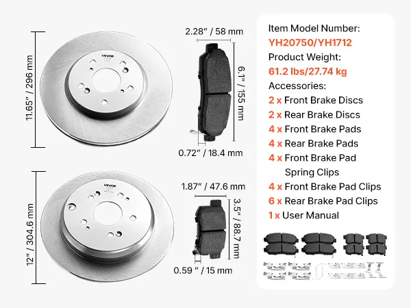 The VEVOR vehicle brake replacement kit is fully equipped for a complete vehicle brake replacement. It comprises 2 front brake discs, 2 rear brake discs, 4 front pads, 4 rear pads, including spring clips and pad clips for the front and rear. This all-in-one kit allows you to replace your entire brake system in one shot. This brake kit for motorcycle or ATV brake set offers consistent braking performance. This brake kit ensures convenience, safety, and continuous vehicle operation.