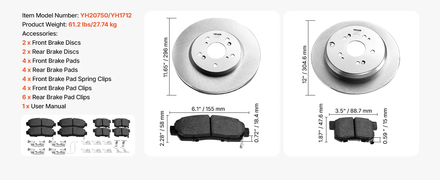 This vehicle brake replacement kit fits all AWD 2012 – 2016 Honda CR-V and other similar vehicles. The design of rotors, pads, and clips is made according to OE specifications. You can enhance your brakes without worrying about compatibility issues with the VEVOR front and rear disc brake system. This is especially suitable for drivers who want to replace their car’s brake system, as it is ideal, cost-effective, and efficient.