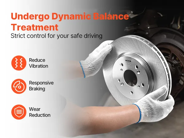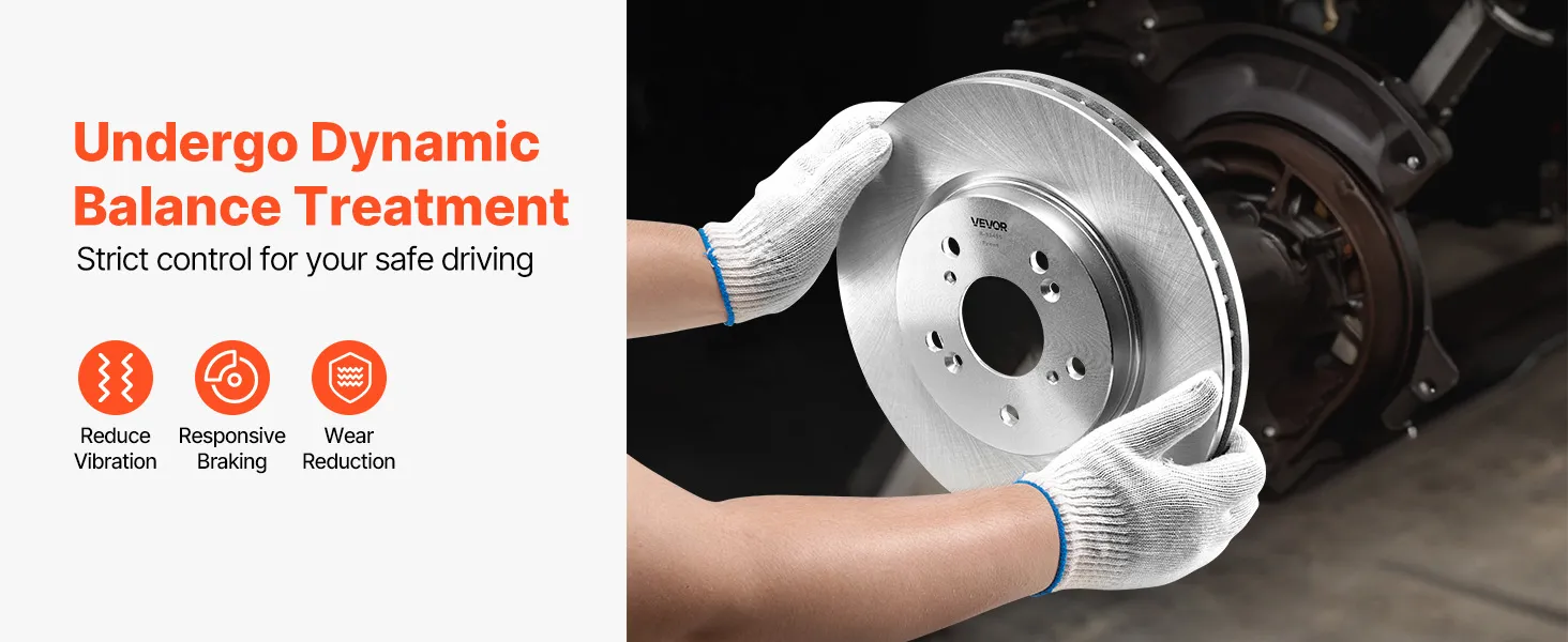 The rotors in the VEVOR performance brake system are manufactured to OE specifications. The front rotors (R-31455) are hollow and 12 inches in diameter, whereas the rear rotors (R-31372) are solid and 12 inches in diameter. The factory-balanced rotors reduce vibration and improve handling for smooth and controlled braking. This disc brake setup at the front and rear is designed for reliability to increase the safety and life of the vehicle. You receive factory-grade results at a much lower cost than the dealership.