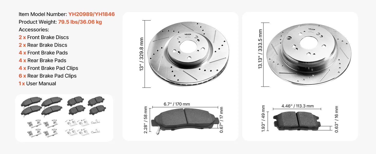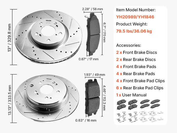 Vehicle Compatibility: Complete front & rear brake replacement kit: 2 front brake discs, 2 rear brake discs, 4 front brake pads, 4 rear brake pads, 4 front brake pad clips, 8 rear brake pad clips. Fit multiple vehicle models; please see the page