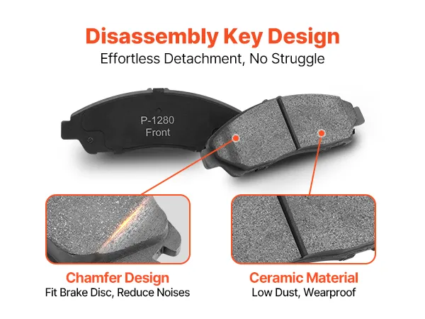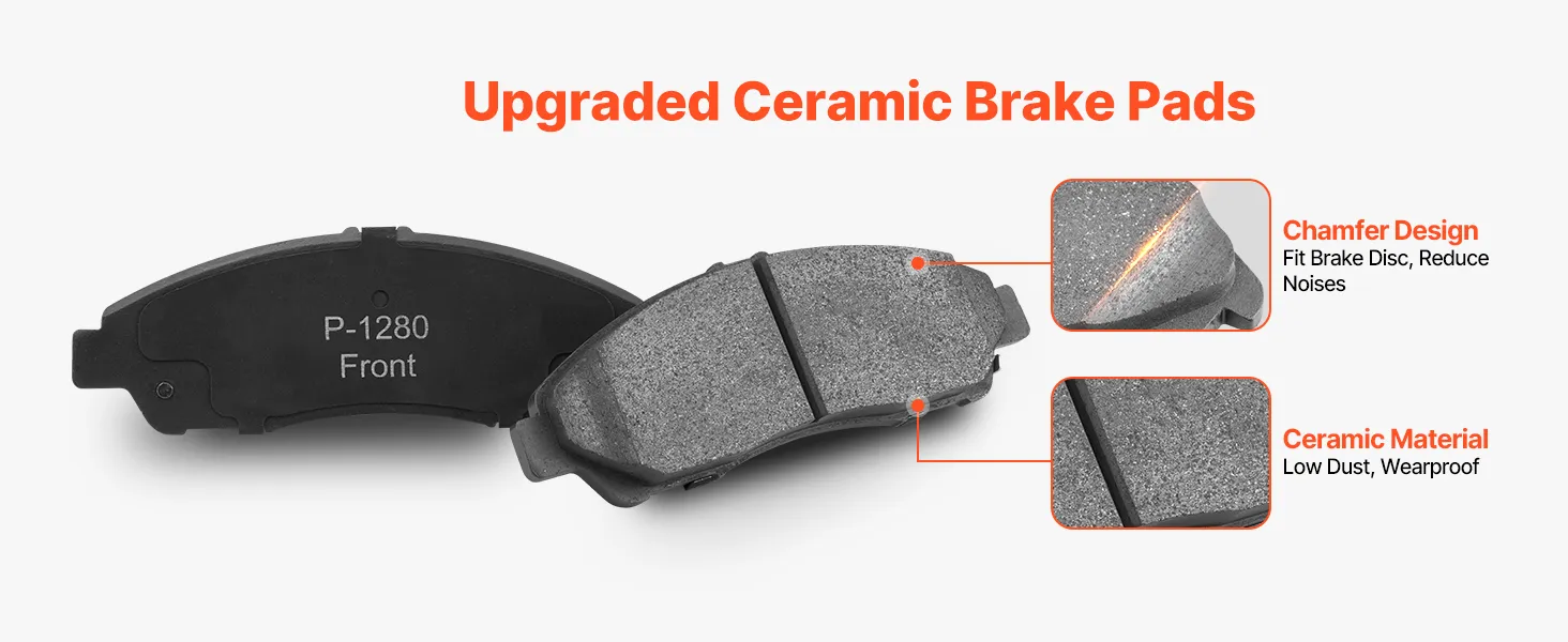 Low Dust and Noise: The brake pads are mainly ceramic, providing superior wear and fade resistance. The ceramic brake pads produce less dust during braking, while their chamfered design ensures a snug fit with the brake rotor, reducing noise
