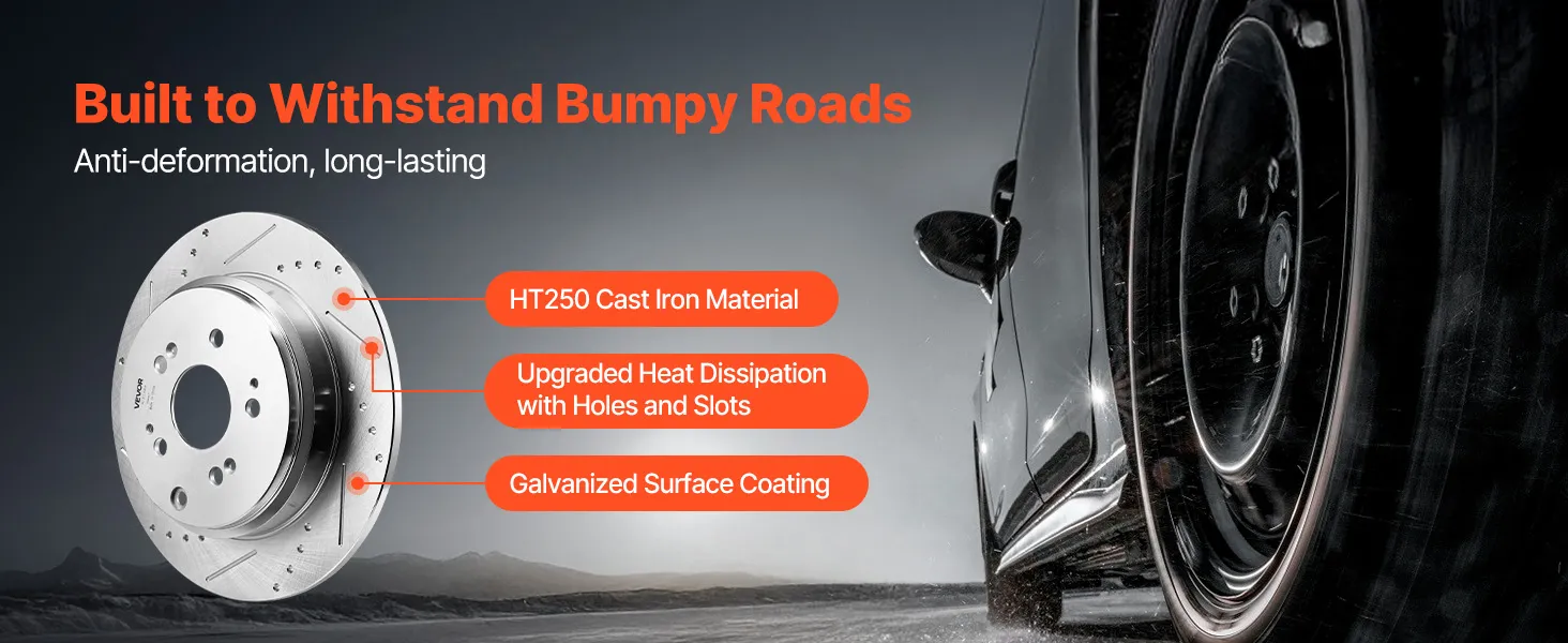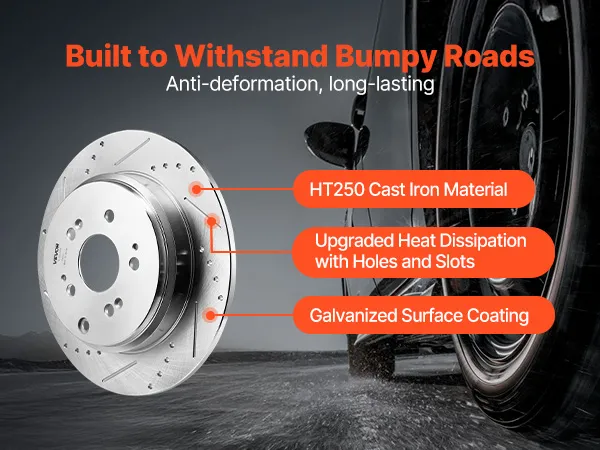 Made from durable HT250 cast iron, these brake rotors are anti-deformation. The slotted and drilled rotors ensure rapid cooling after braking under heavy loads.