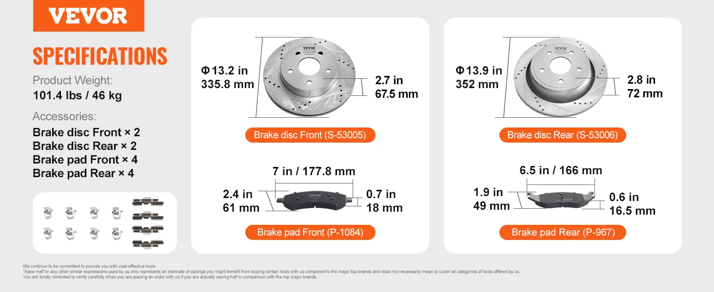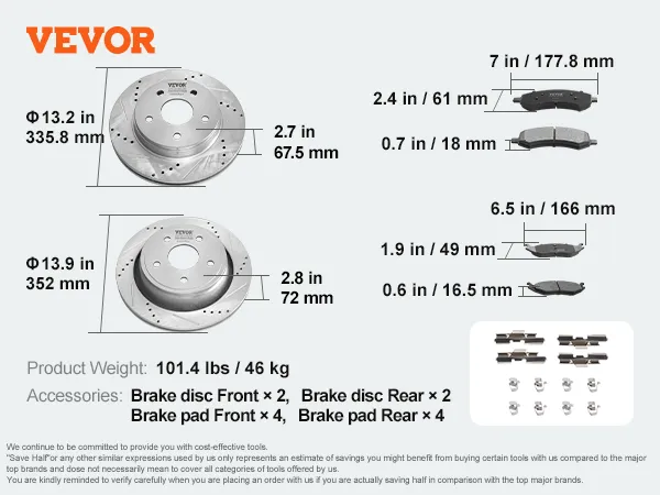 The VEVOR front and rear brake rotors kit includes everything you need for a complete brake upgrade. It comes with 2 front rotors, 2 rear rotors, 4 front brake pads, and 4 rear brake pads. This comprehensive set makes installation easy. The exact fit ensures the components work seamlessly together. You won't have to buy additional parts. That saves you time and money. High-quality materials ensure the kit lasts longer. Easy installation process allows you to upgrade your brakes quickly. Enjoy enhanced braking performance with minimal effort.