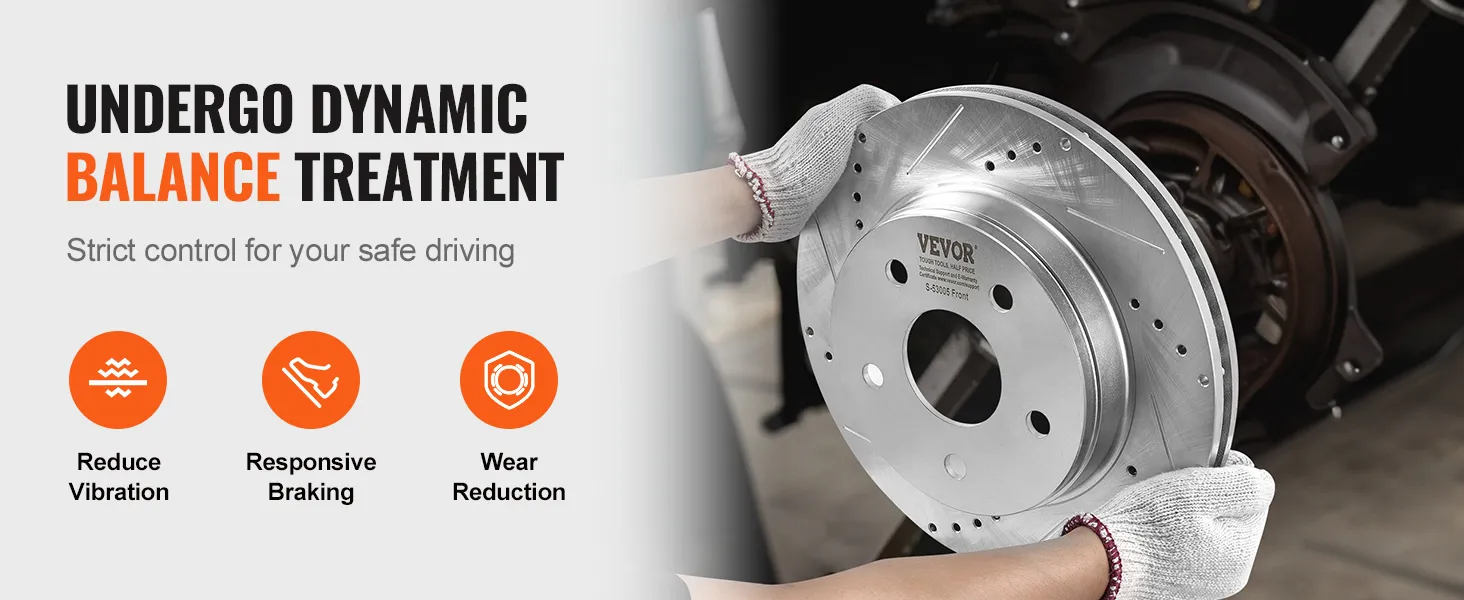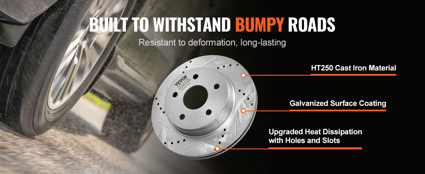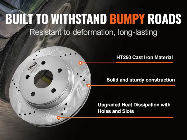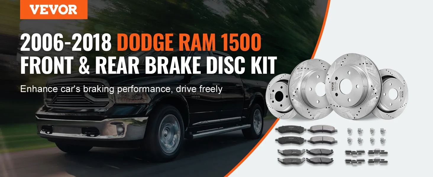 This is why VEVOR's brake rotor kit for dodge ram 1500 improves your vehicle's braking performance. The drilled and slotted design improves heat dissipation. The drilled slotted brake rotors design also prevents water and dust accumulation. The brake rotors and pads kit ensures the rotors perform well in all conditions. Made from durable HT250 cast iron, these rotor systems provide reliable performance even under heavy loads. Their high-quality construction guarantees long-lasting use. These features make them ideal for various driving conditions. You can trust this rotational system for emergency stopping. They provide consistent performance and stability. Upgrade your dodge RAM 1500 with these superior brake discs.