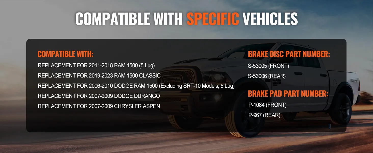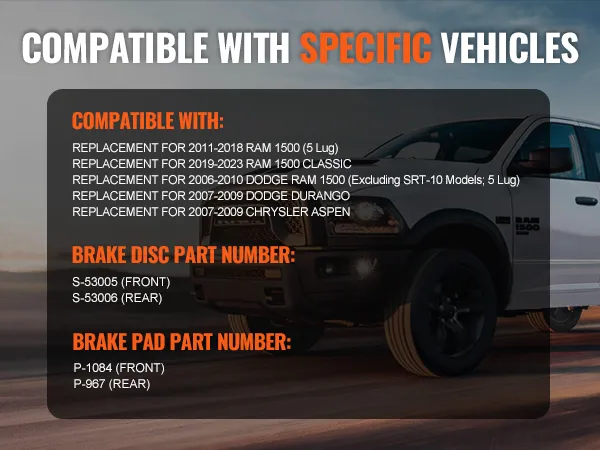 Vehicle Compatibility: Complete front and rear brake kit includes 2 front rotors, 2 rear rotors, 4 front brake pads, and 4 rear brake pads. The front rotor dia.: 13.2"/335.8 mm, and the rear rotor dia..: 13.9"/352 mm. Compatible with 2006-2010 Dodge Ram 1500 (Excluding SRT-10 Models; 5 Lug), 2011-2018 Ram 1500 (5 Lug), 2019-2023 Ram 1500 Classic, 2007-2009 Chrysler Aspen, and 2007-2009 Dodge Durango.