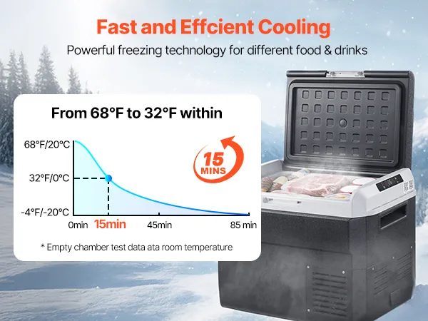 Enfriamiento Rápido: Experimente un enfriamiento rápido y eficiente con nuestro refrigerador para auto. Equipado con un compresor mejorado, puede enfriar de 20 °C a 0 °C en solo 15 minutos y a -20 °C en 70 minutos, garantizando que sus bebidas y alimentos se mantengan frescos.