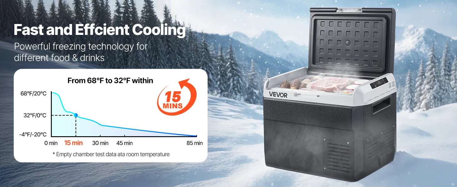 El refrigerador para automóvil de 31,7 cuartos cuenta con un compresor mejorado que puede enfriar rápidamente en 15 minutos a temperatura ambiente, capaz de almacenar tanto a temperaturas altas como bajas, ideal para viajes cortos.