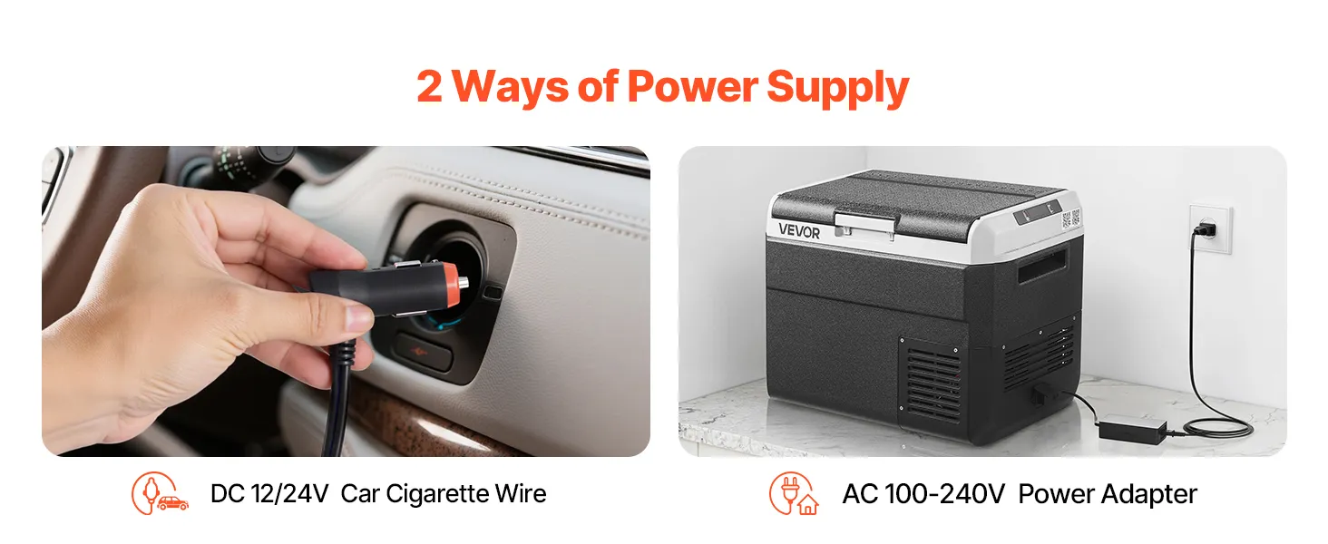 Uso dual para el hogar y el automóvil: el refrigerador portátil está equipado con un cable de alimentación de CA de 100-240 V, un cable para encendedor de automóvil de CC de 12/24 V y un adaptador, lo que permite una fácil conexión al puerto del encendedor de su automóvil/RV, enchufes domésticos y otras fuentes de energía.