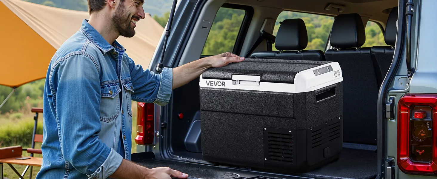 Refrigerador para coche VEVOR de 12 voltios, 31,7 cuartos/30 litros, enfriador eléctrico portátil con temperatura ajustable de -20 °C a 20 °C, compresor de 12/24 V CC y 100-240 V CA, ideal para exteriores, camping, viajes y autocaravanas.