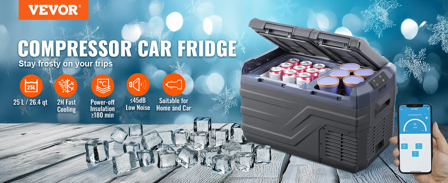 Refrigerador para coche VEVOR de 12 voltios, congelador portátil de doble zona de 25 L, rango ajustable de -20 °C a 20 °C, compresor de 12/24 V CC y 100-240 V CA para exteriores, camping y autocaravanas.