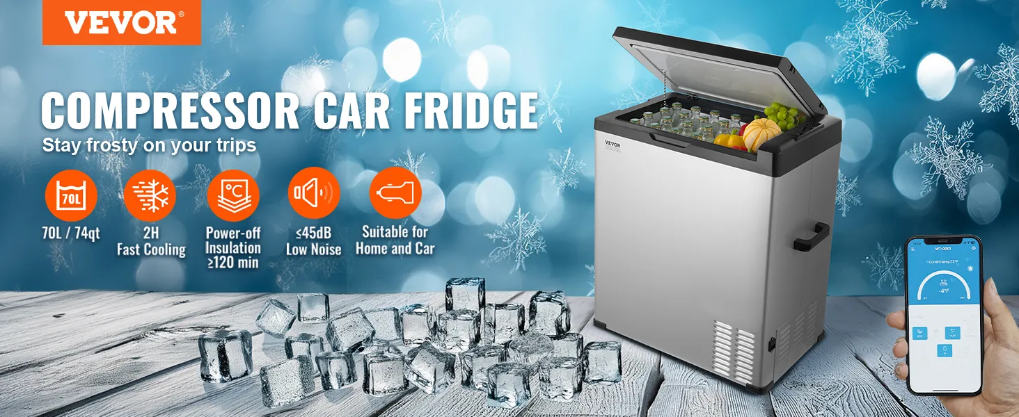 Refrigerador para coche VEVOR de 12 voltios, congelador portátil de una sola zona de 70 L, rango ajustable de -20 °C a 20 °C, compresor de 12/24 V CC y 100-240 V CA para exteriores, camping y autocaravanas.