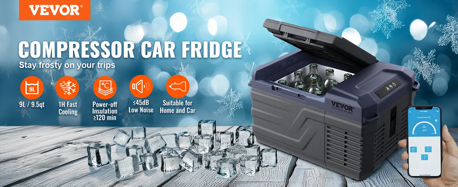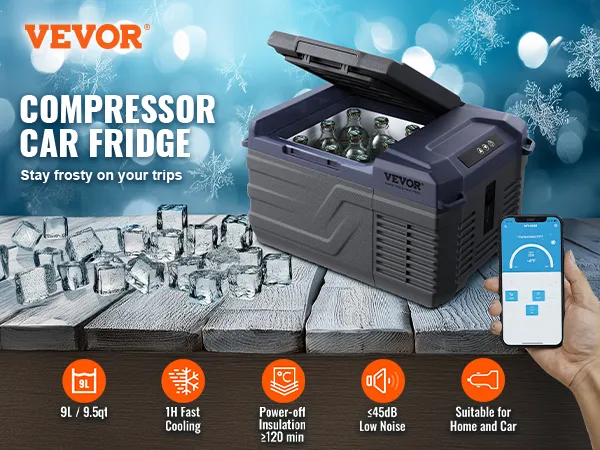 Refrigerador para coche VEVOR de 12 voltios, congelador portátil de una sola zona de 9 L, rango ajustable de -20 °C a 20 °C, compresor de 12/24 V CC y 100-240 V CA para exteriores, camping y autocaravanas.