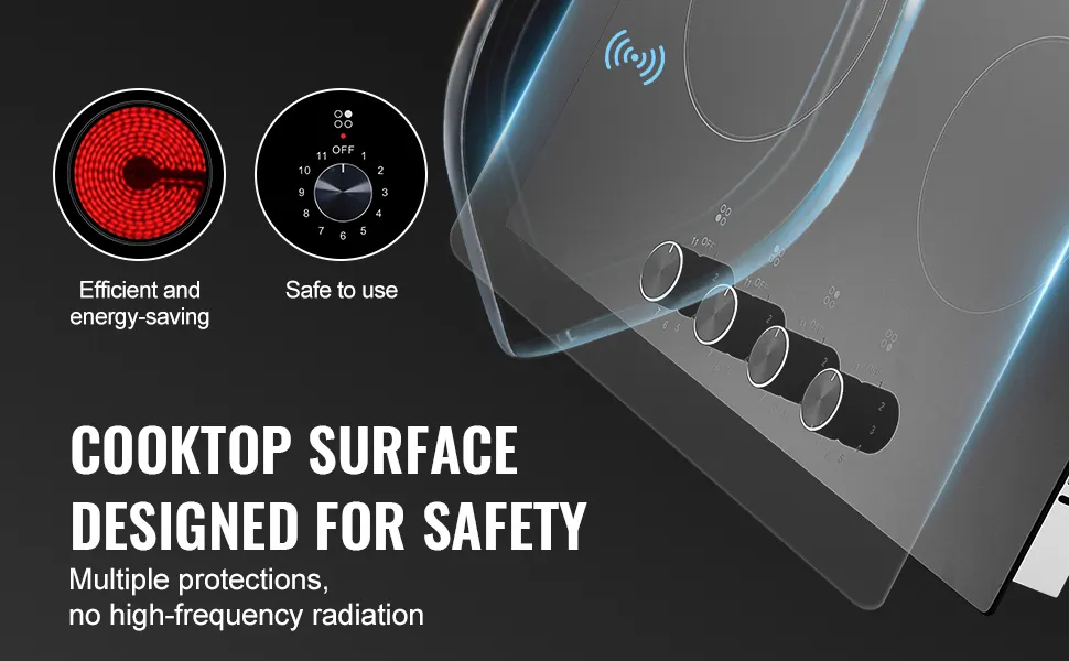 Safety is an essential part of any kitchen appliance, and this knob-control electric cooktop is designed with protective features that let you cook with confidence. The radiant ceramic surface works without high-frequency radiation, making it safe for everyday use by all family members. Its design is especially considerate for the elderly and expectant mothers. With four burners running at once, you can easily prepare large meals for holidays, gatherings, or special occasions while still enjoying safe, steady, and dependable performance.