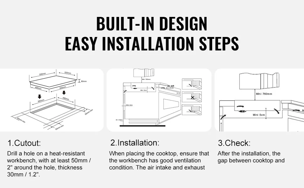 The 24-inch electric cooktop will become a space-saving addition to your kitchen, apartment, outdoor installation, or rental house.The scratch-resistant glass face is simple to clean by wiping up, and thus the kitchen remains clean and maintained after each usage.The cutout size required is 560 x 490 mm (22 x 19.3 inches), which makes it easy and time-saving to install.When installed, the cooktop will merge so well with your countertop and make your area look like a sleek and professional-looking place.