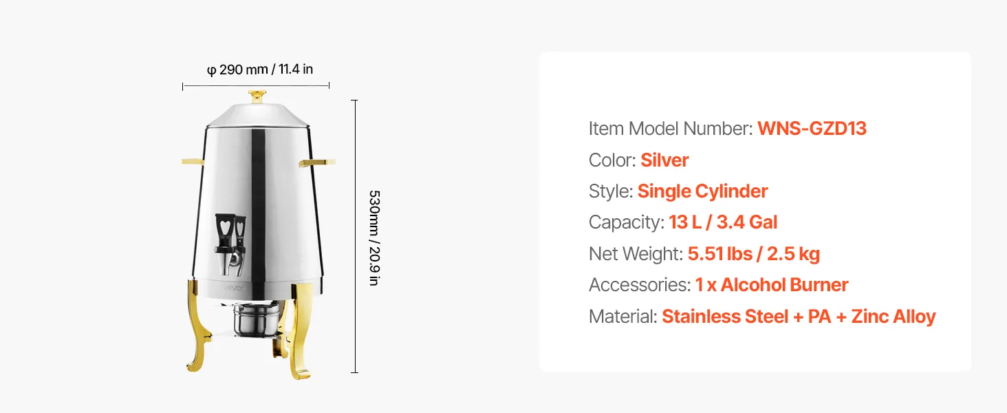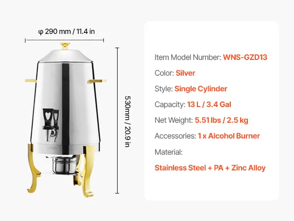 VEVOR Stainless Steel Beverage Dispenser, 3.4 Gallon Drink Dispenser with Alcohol Burner, Hot & Cold Drink Dispensers with Spigot for Coffee Tea Hot Water, Ideal for Restaurants, Hotels, Parties
