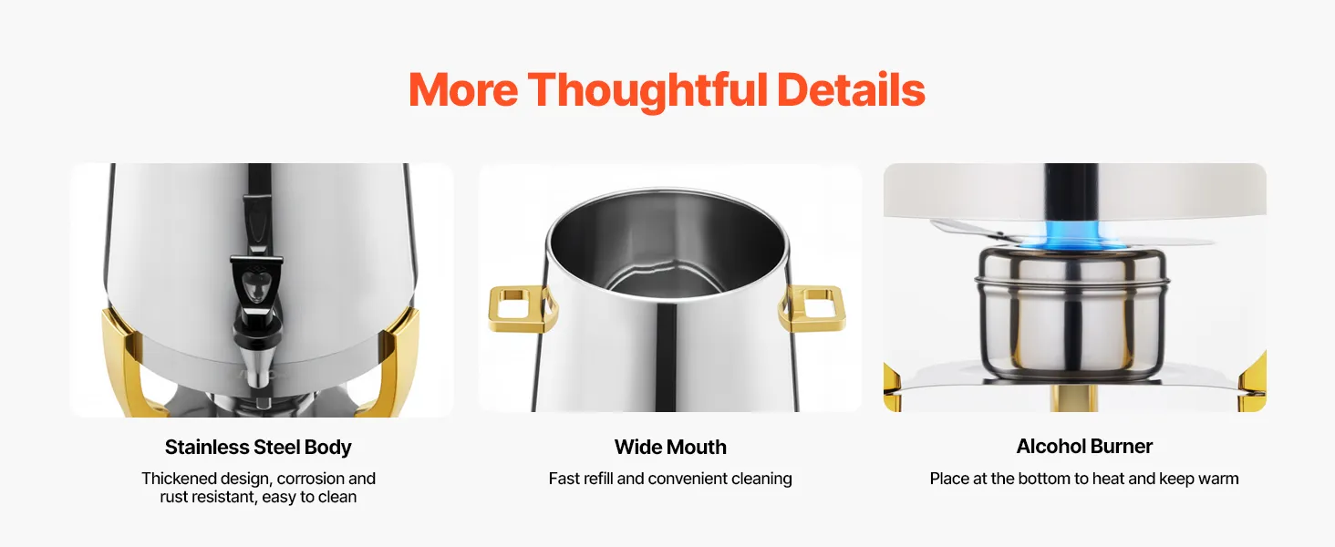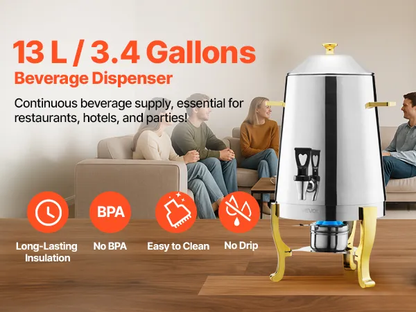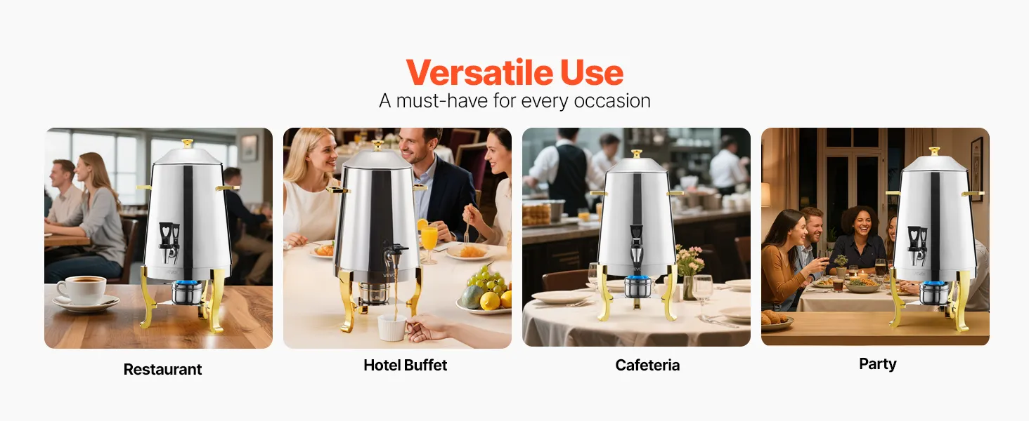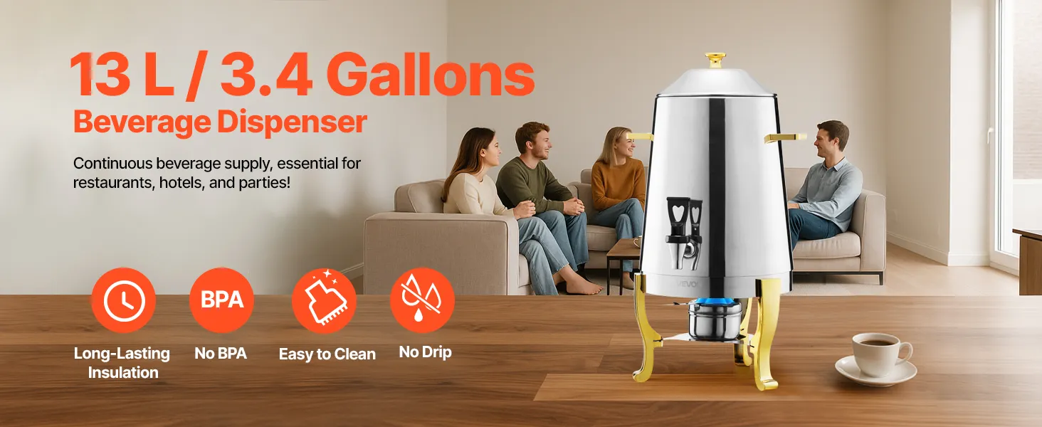 3.4 Gallon Large Capacity: Our hot beverage dispenser has a large capacity of 3.4 gallon, designed to save you time and reduce the need for frequent refills. It ensures a continuous supply of your beverages for busy restaurants, hotels, and parties