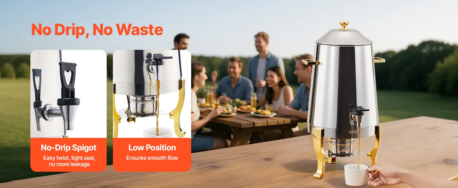 Whether for busy restaurants, elegant hotels, or cozy family gatherings, this stainless steel large drink dispenser offers a perfect beverage experience for you and your guests.