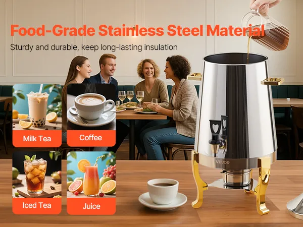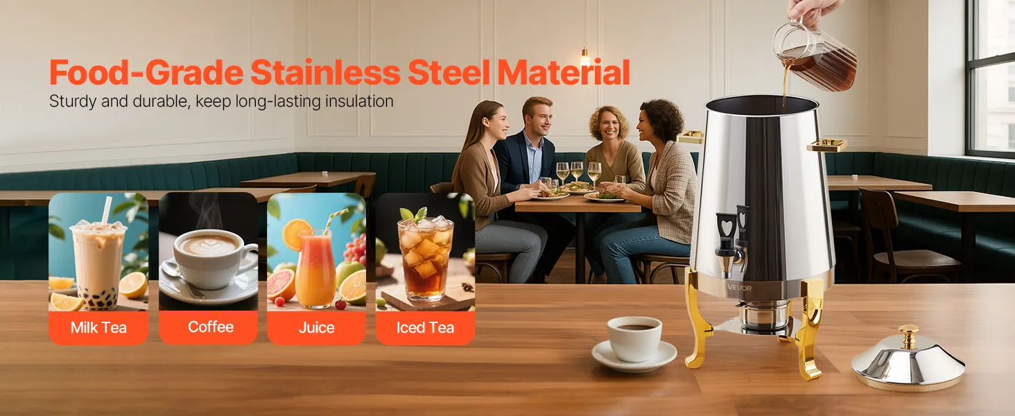 Made from food-grade stainless steel, the hot/cold drink dispenser is stain-resistant, durable. Ideal for hot coffee, iced tea, juice, or water.