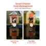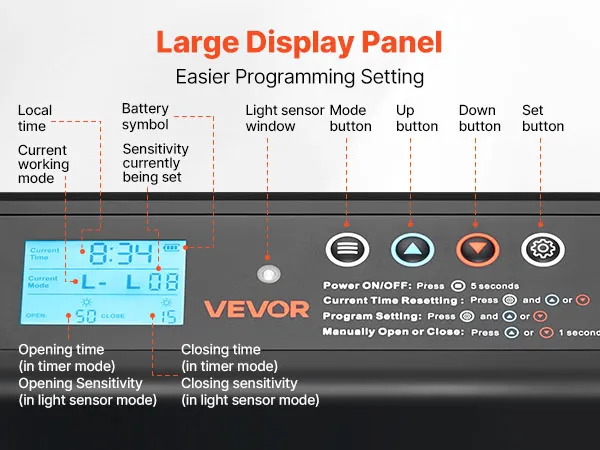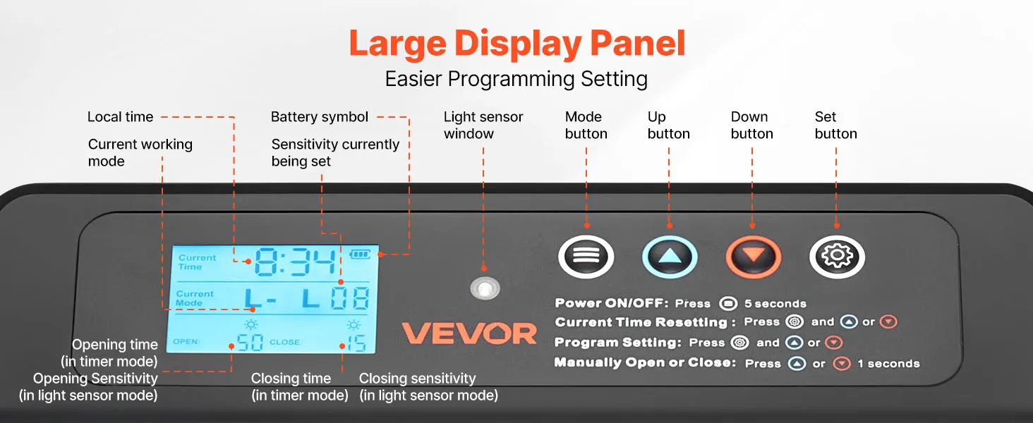The electric chicken door features large display panel that shows time, door status, and settings at a glance. Simple to adjust schedules, change settings, or check system status.