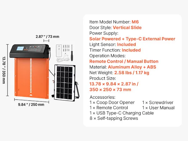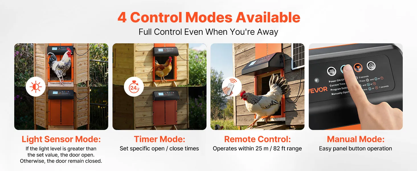 This solar powered chicken door supports four modes for flexible management. Light-sensor (opens at dawn, closes at dusk), timer (set custom times), remote control, and manual button operation.