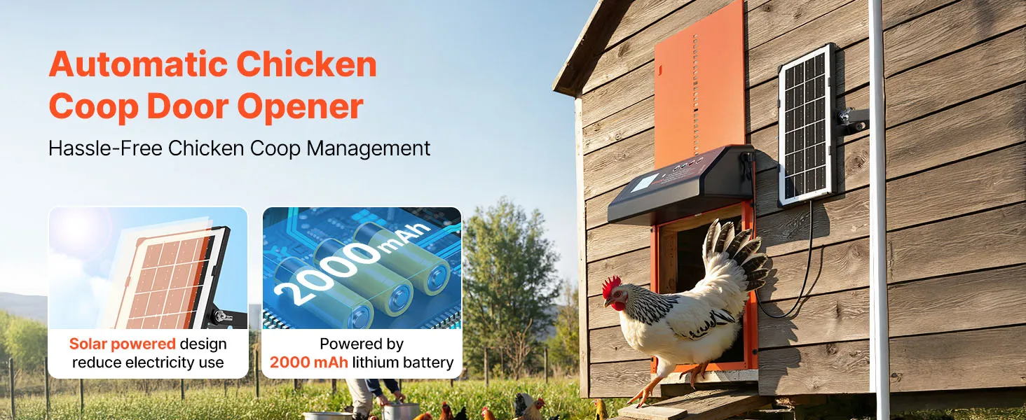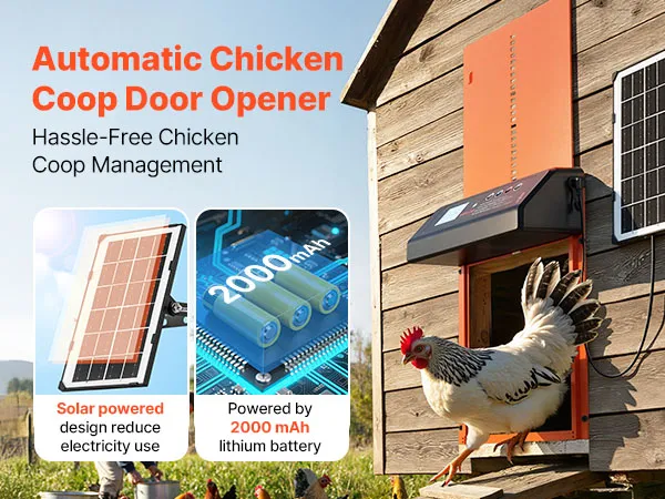 The automatic chicken coop door runs on solar power by day and a built-in 2000mAh lithium battery at night. It ensures all day long operation, saves energy, and reduces electricity costs.