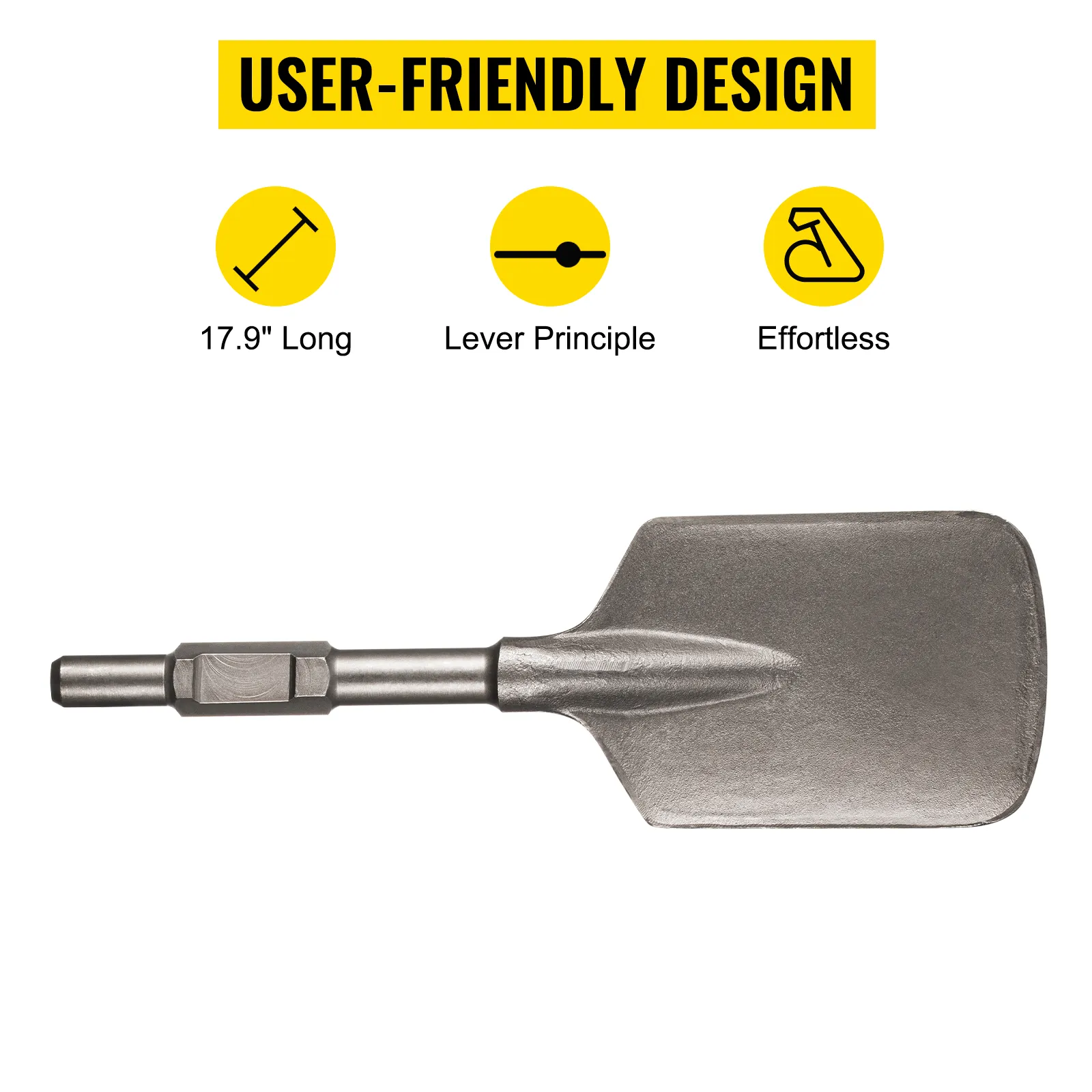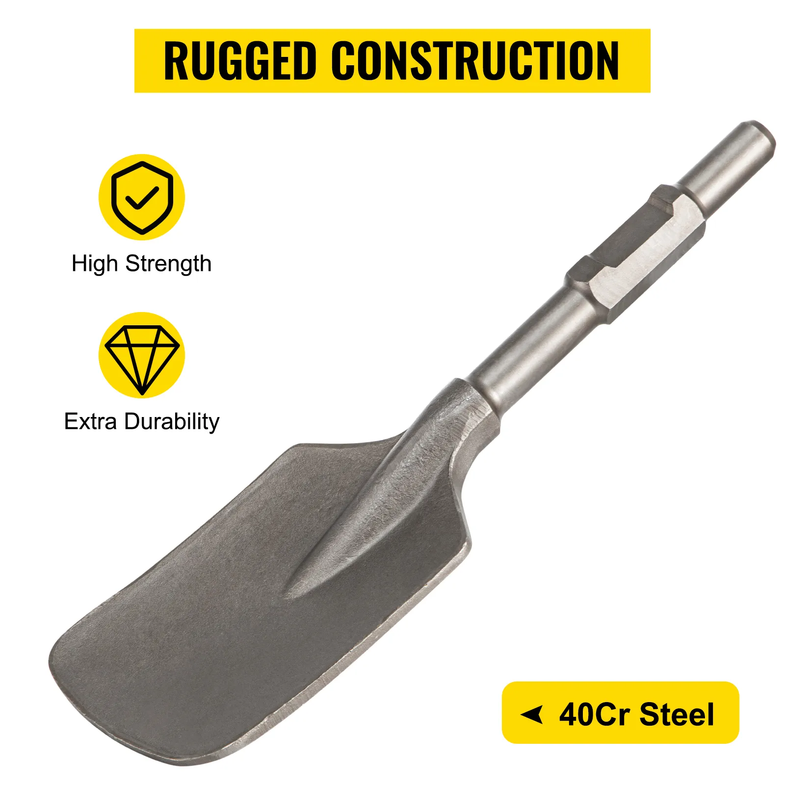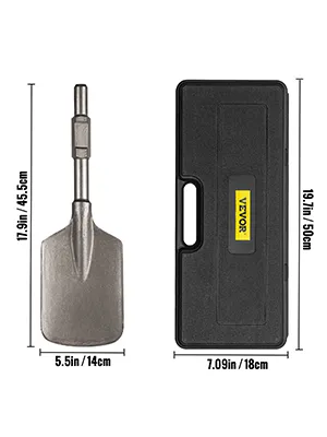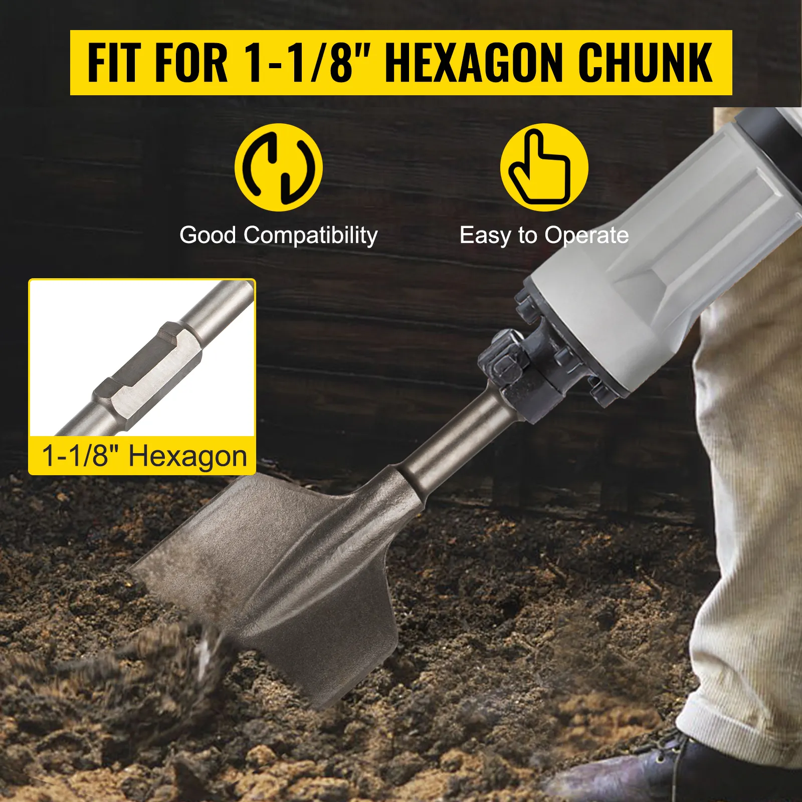 This clay chisel shovel features a 1-1/8" sized rotary hammer shank for compatibility with Bosch, DeWalt, Makita, Milwaukee, Hilti, or other 1-1/8" Hexagon hammer drills.