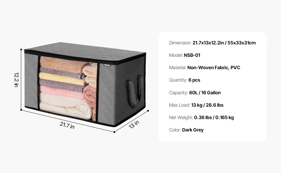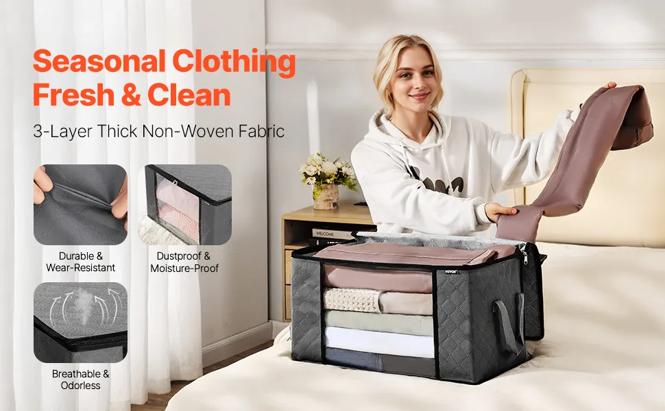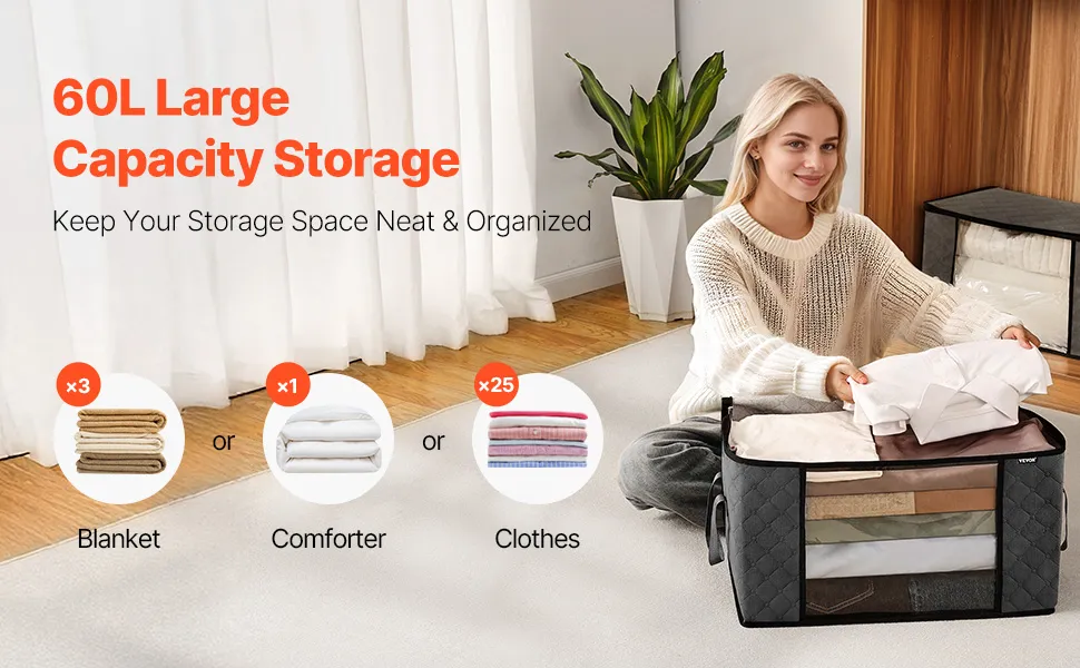 Oversized bedding items fit in comfortably without being squished or crowded. The blanket storage bags offer a generous 60L of space, perfect for blankets, comforters, pillows, and bed sheets. You can store more than one item together, which helps keep closets and bedrooms less cluttered. These bags are ideal for storing items that are only needed for a short time, which helps keep living areas neat. Bulky bedding retains its fluffiness, which helps protect the fabric from damage. They help people keep their linen collections organized and their homes clean. These storage bags are ideal for anyone who needs a convenient, large-capacity way to store bedding and fabrics.
