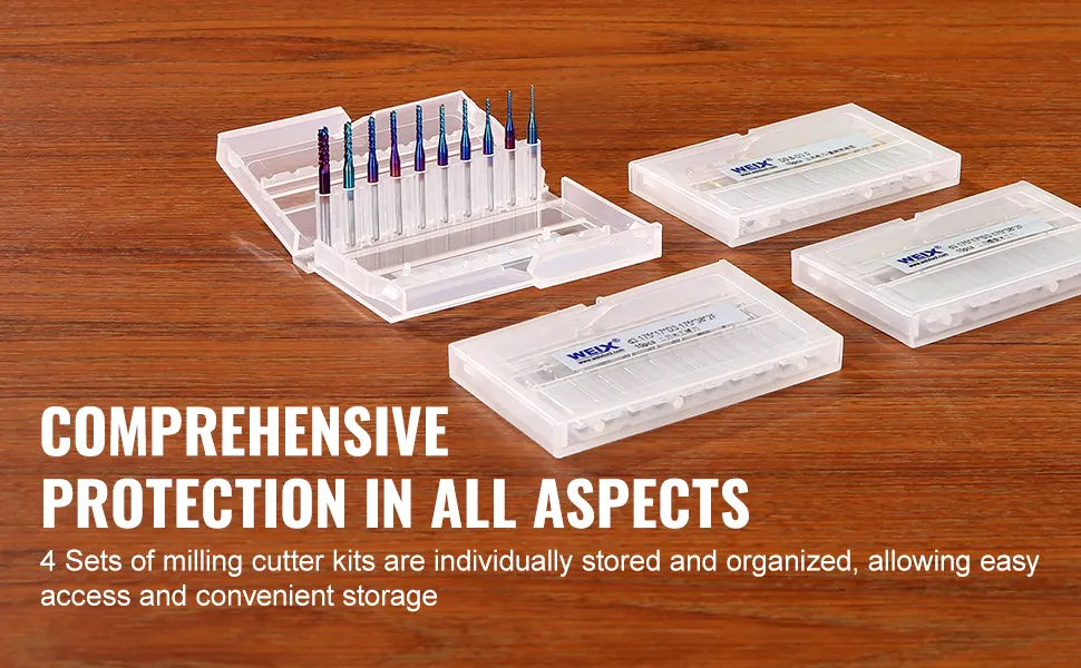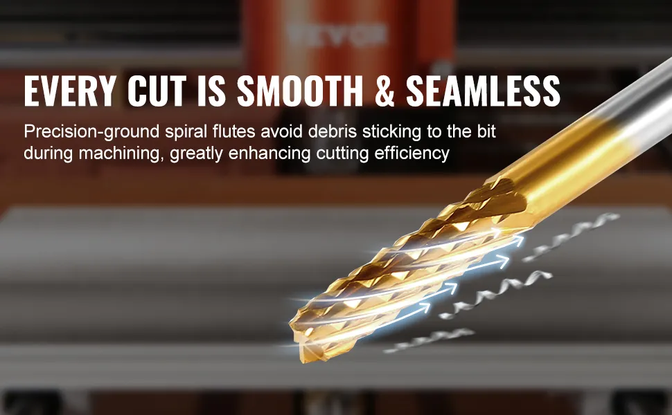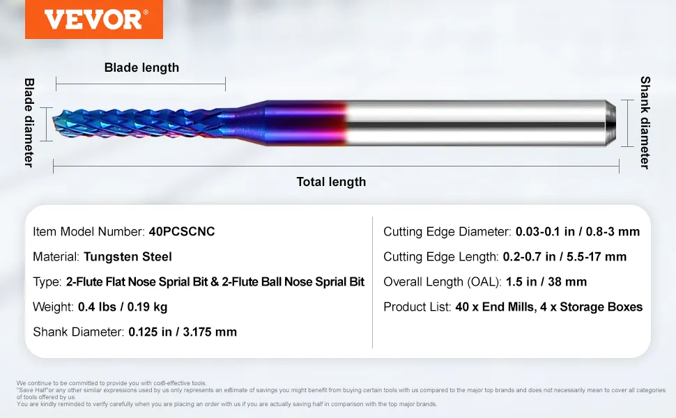VEVOR 40pcs milling cutter set includes 10 x spiral flat nose, 10 x spiral ball nose, 10 x nano blue coating, and 10 x titanium coating end mills, catering to your diverse needs. With high-quality tungsten steel, you can easily process and mill PCBs, SMTs, CNCs, molds, plastic fibers, etc.