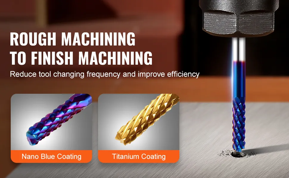Wear-Resistant Coatings: The CNC router bit end mill features a high hardness and heat-resistant nano blue coating and titanium coating to extend service life and deliver optimal cutting results. Ideal for processing materials such as carbon steel, soft alloy steel, tool steel, cast iron, and aluminum alloys.