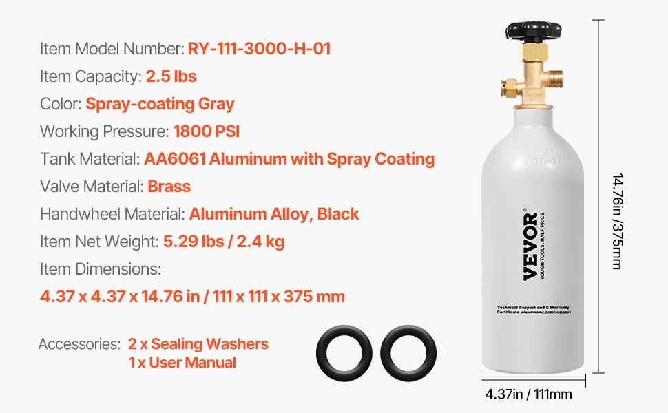 Compact, Durable 2.5 lbs CO2 Tank: Our CO2 tank boasts a lightweight 5.29 lbs aluminum alloy body for exceptional strength and resistance. The light gray spray coating enhances its visual appeal and keeps the tank from wear and tear. Tip: The tank is shipped empty