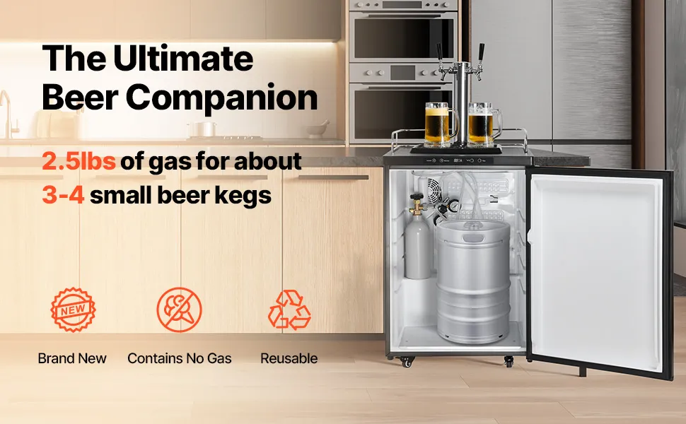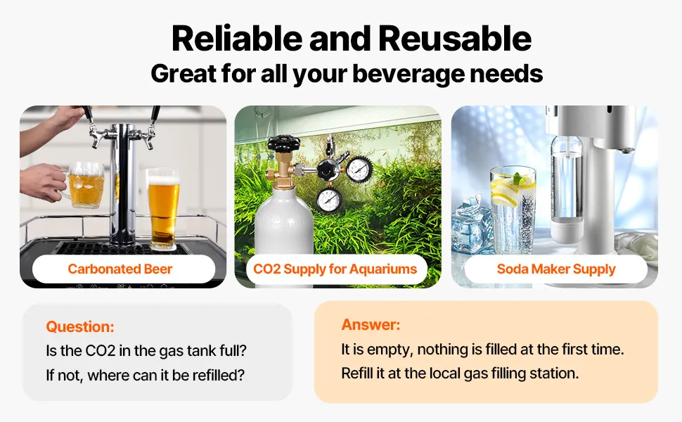 Your Go-to Beer Companion: Designed without pre-filled gas, our CO2 cylinder tank can be loaded with 2.5 lbs of food-grade, 99.95% pure CO2 compliant with E290 standards. It's reusable and ideal for dispensing around 3-4 small beer kegs, making it an essential addition to any beer enthusiast's setup