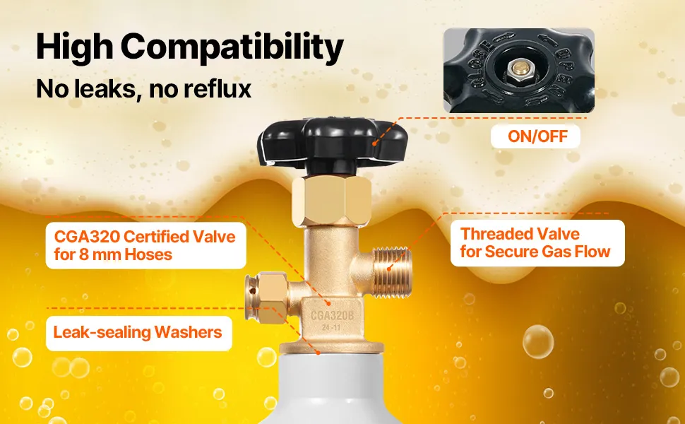 Leak-proof Design: Our CO2 gas tank contains a CGA320 standard valve, compatible with 8 mm hoses and featuring external threading for CO2 regulators. Additionally, it comes with washers to effectively stop gas leaks for peace of mind