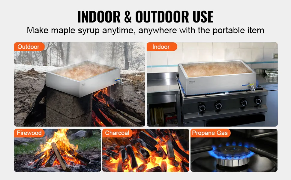 Versatile Heating Options: Our evaporator pan is compatible with multiple heat sources, including wood, charcoal, or propane, allowing for flexible use indoors or outdoors.