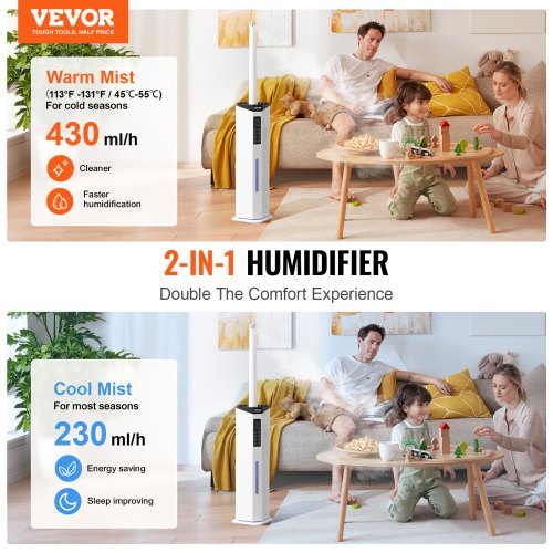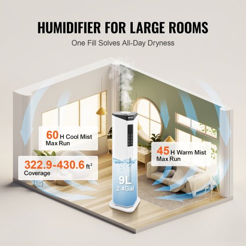 VEVOR Commercial Humidifier, 2.4 Gal/9L 2-In-1 Cool/Warm Mist, Industrial Air Vaporizer for Room Up To 430.6 Sq Ft,Top Refill Humidifier w/ Auto Rotary Spray for Whole House,Greenhouse, Plant