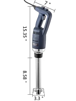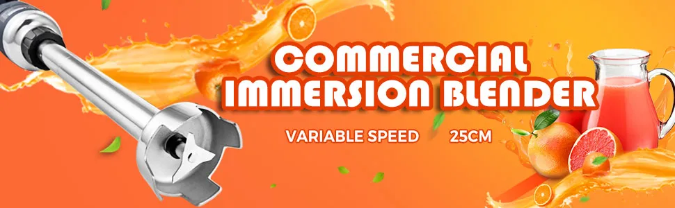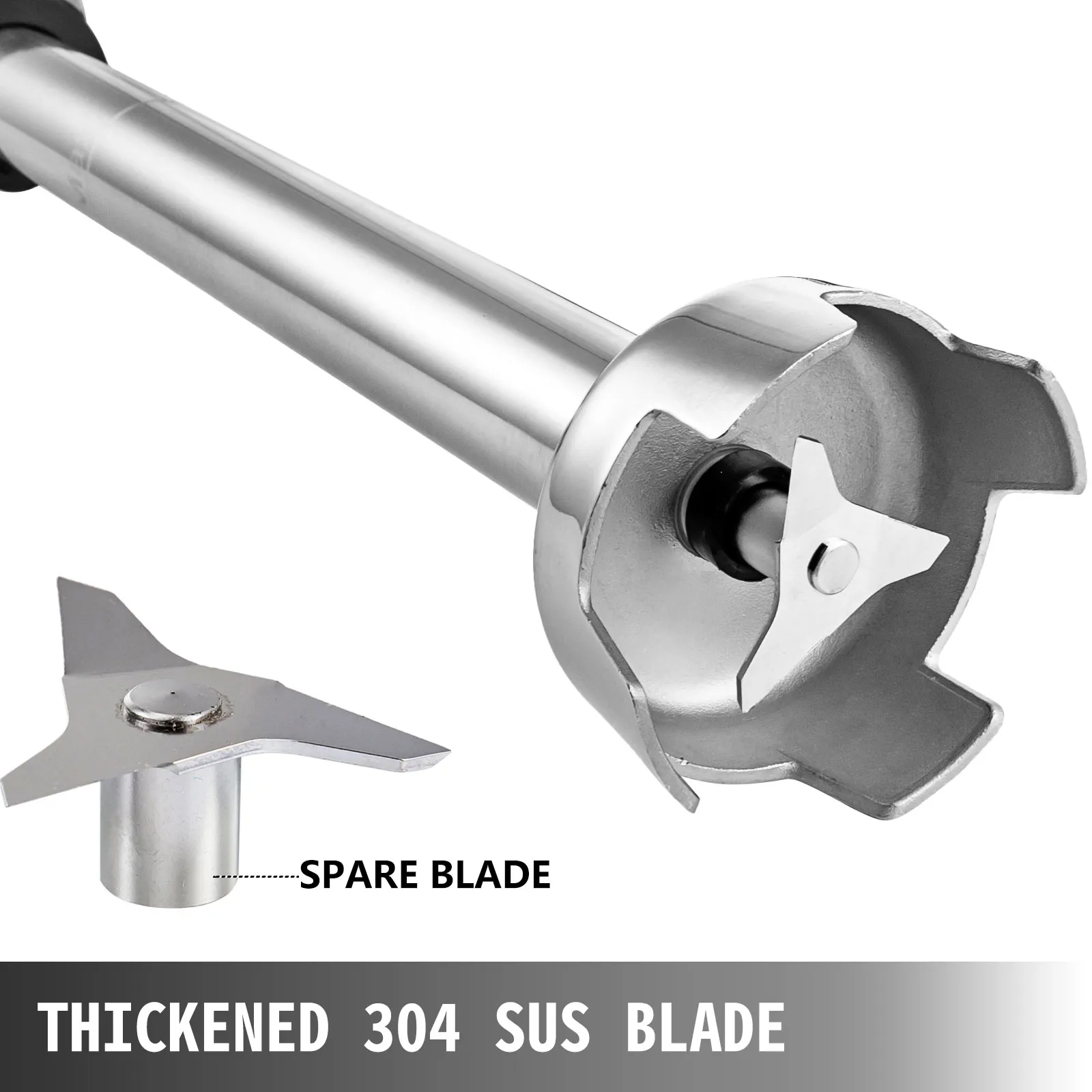 This high-performance immersion blender makes quick work of food-prep tasks, which can blend smoothies, puree soups, mix cake batter, chop nuts and meat, and more. All the parts that attached to food are made of 304 stainless steel, safe and sanitary. The extra-long shaft is designed for deeper reaching of the pots or bowl. The high rotation speed is perfect for commercial use.
