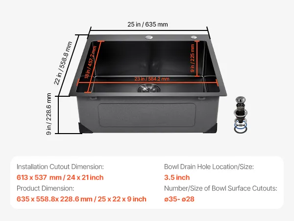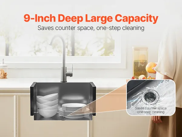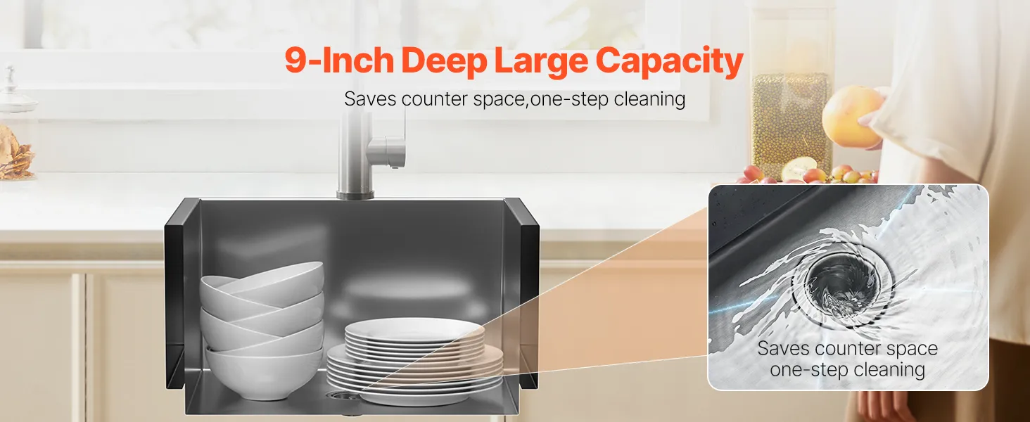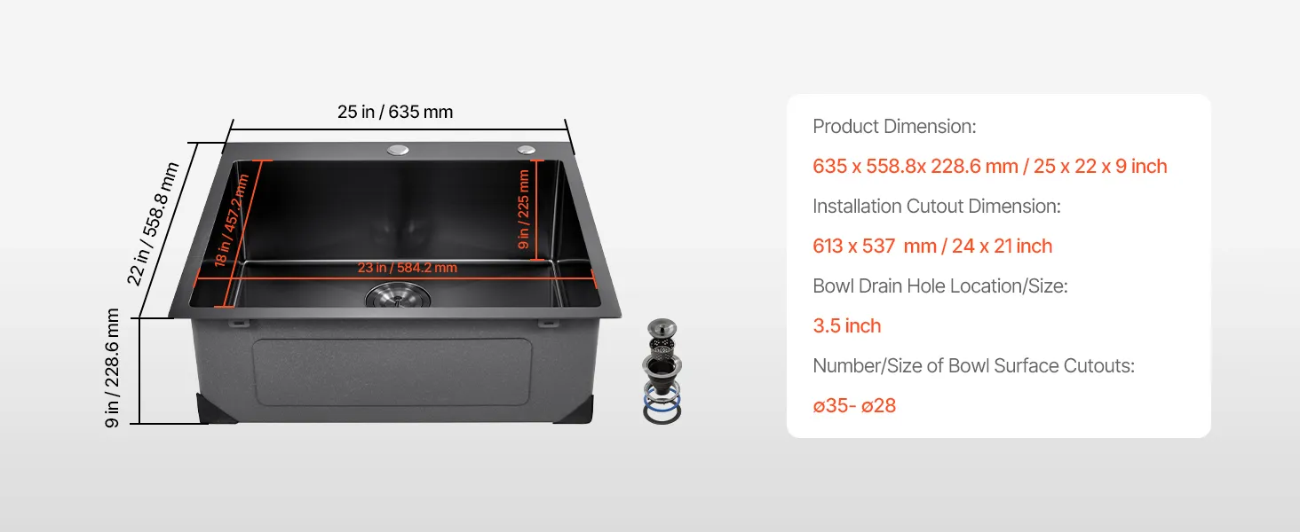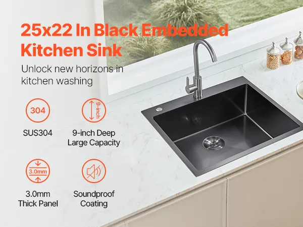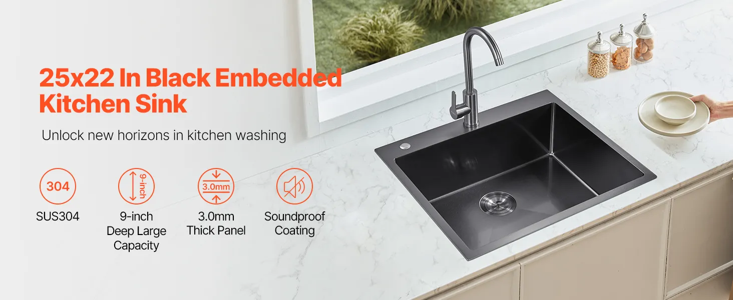 Large Capacity: Sink External Dimension: 25x22 inch. Internal Dimension: 24x21 inch. Bowl depth: 9 inch. This kitchen drop-in basin is deep enough to accommodate cups, pots, and baking trays, meeting various washing needs.