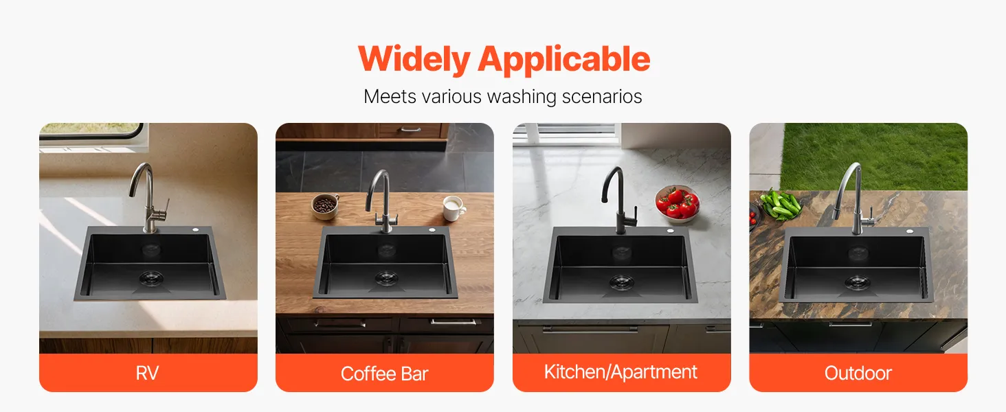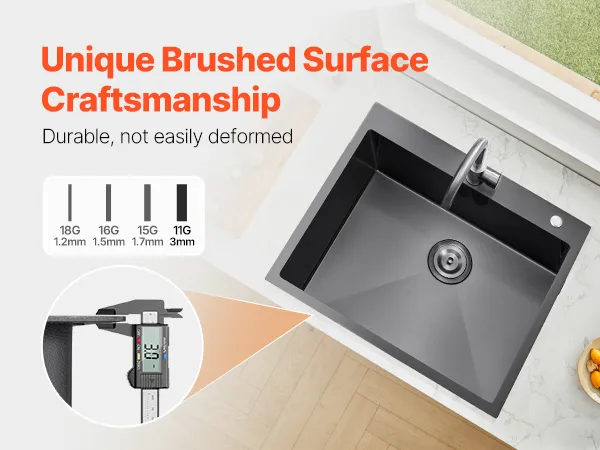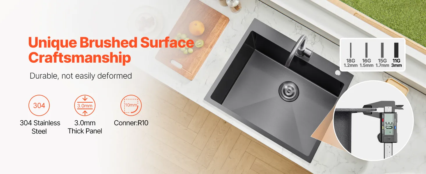 Premium Nano Black Finish: Featuring an innovative nano PVD brushed surface, this kitchen sink workstation is corrosion-resistant, dent-resistant, and easy to clean. Again, avoid sharp objects to prevent surface scratches. The upgraded panel thickness is 3 mm, 50% thicker than most standard kitchen sinks. It features R10° rounded corners for easy cleaning and a modern aesthetic.
