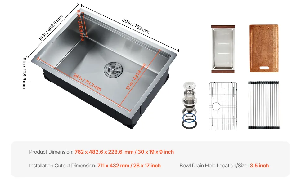 • Large Capacity: Sink External Dimension: 30x19 inch. Internal Dimension: 28x17 inch. Bowl depth: 9 inch. This kitchen drop-in basin is deep enough to accommodate cups, pots, and baking trays, meeting various washing needs.