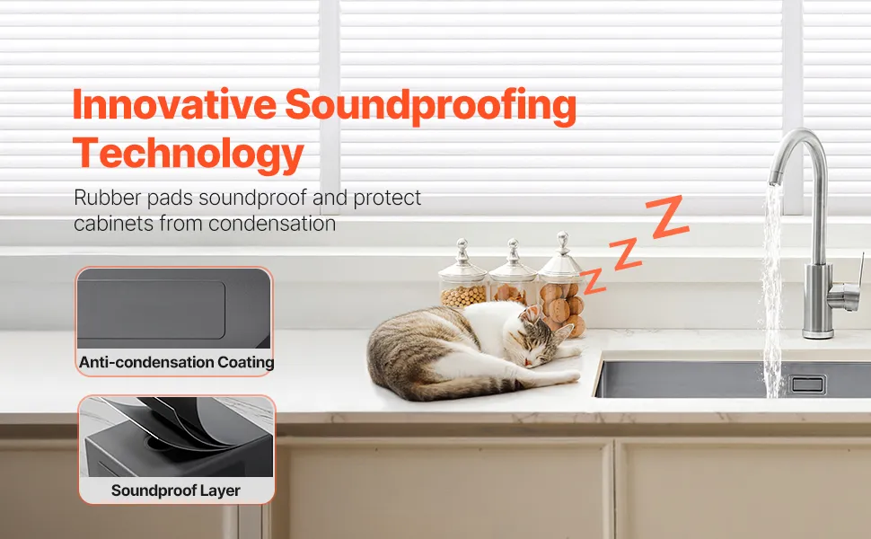 This drop-in farmhouse basin uses soundproof pads and base coat insulation materials to reduce noise, ensuring excellent sound reduction and quiet reliability. The thick base coat prevents condensation.